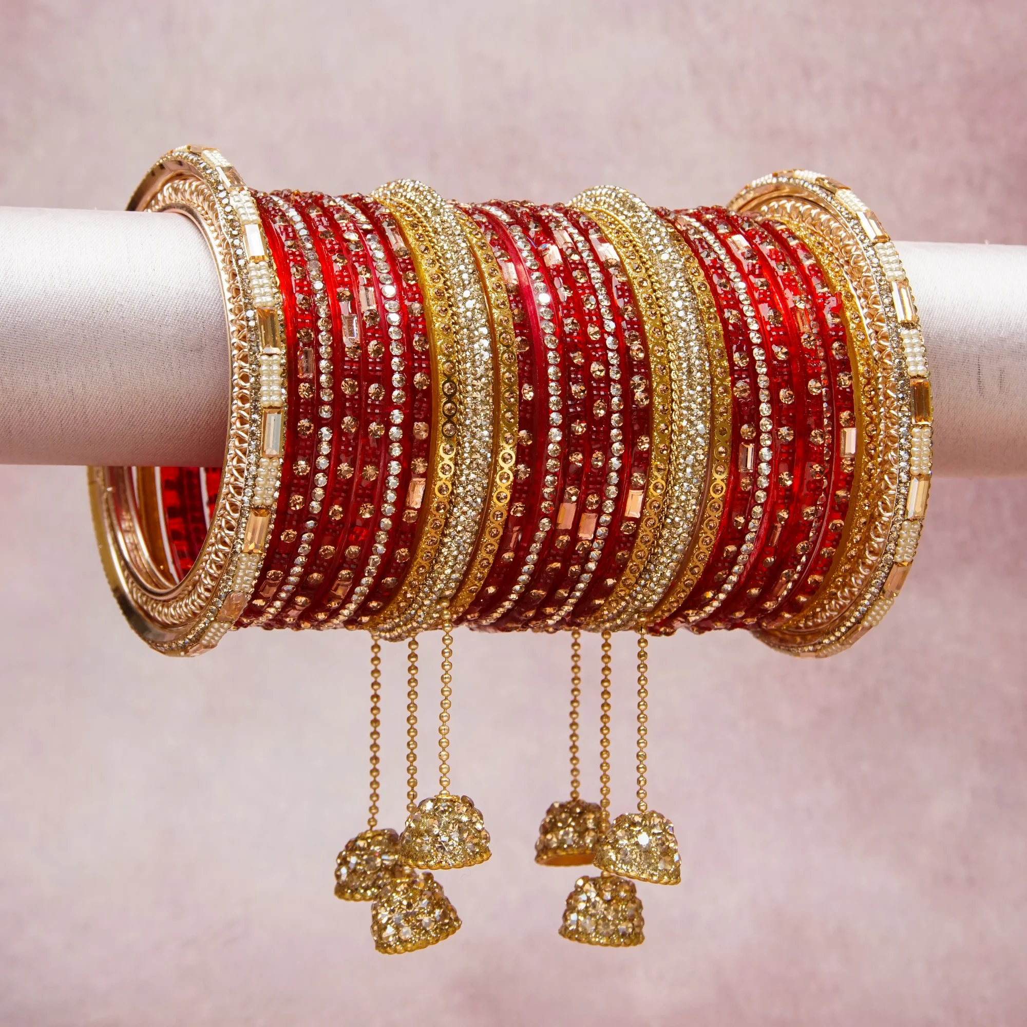 A thoughtful composition of Glass (for red bangles), Gold-plated Brass (for gold bangles, chains, and bells), Cubic Zirco.nia (for clear and champagne crystals), Imitation Pearl (for cream beads), designed to feel complete without being heavy.