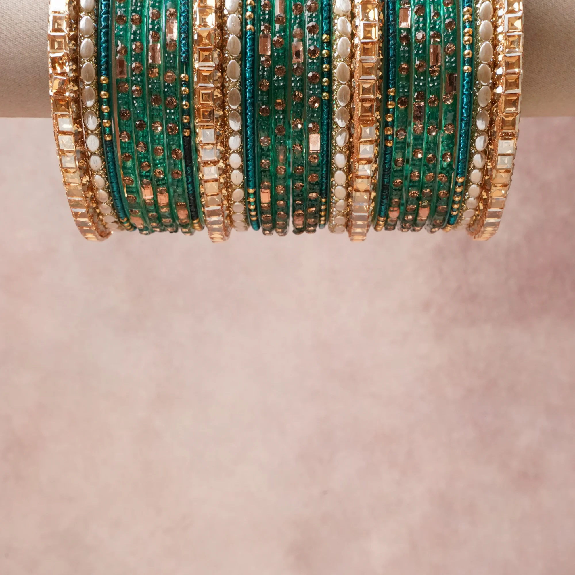 A grounding Deep Emerald Green forms the heart of the set, while touches of Champagne Peach, Cream, Clear Crystal add charm.