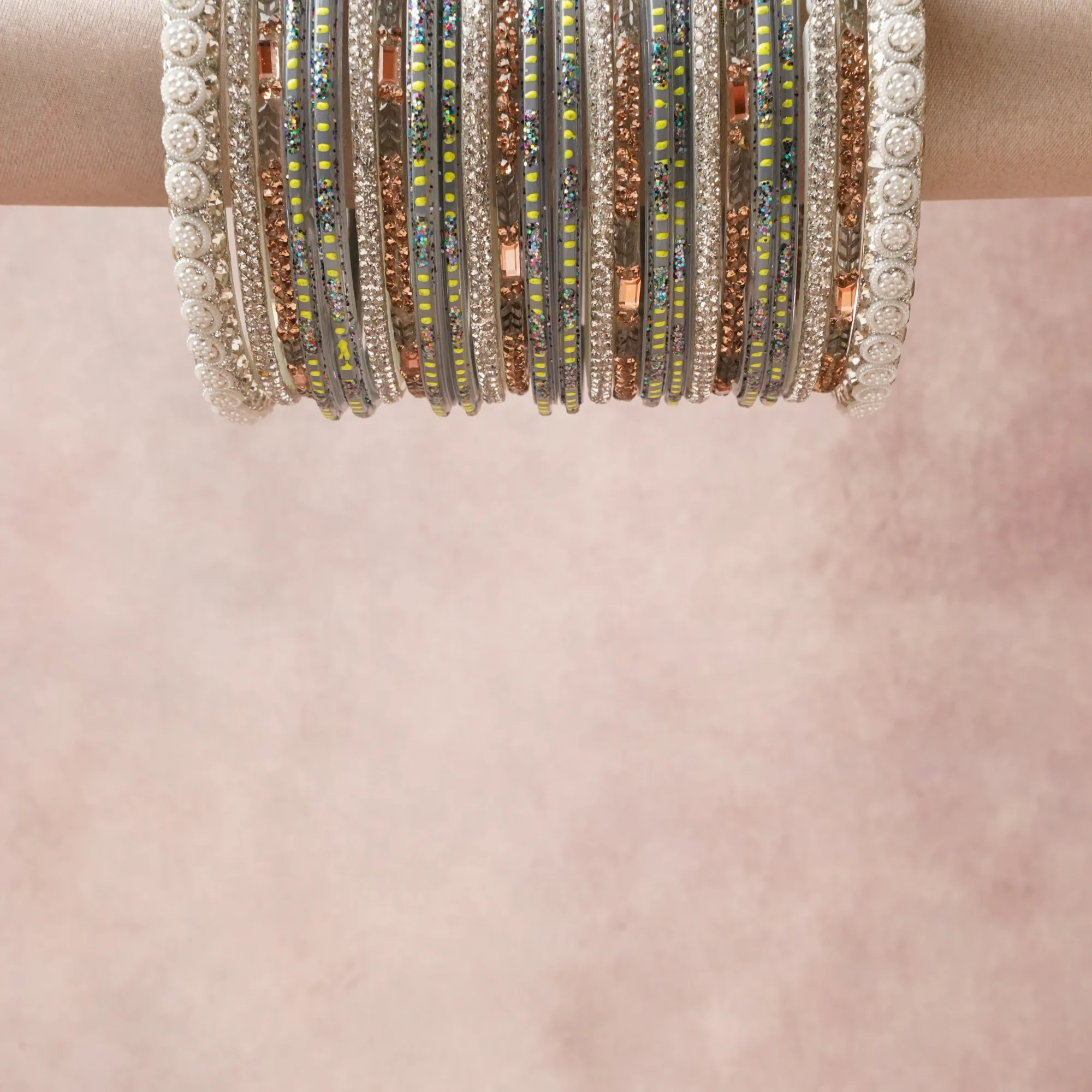 A grounding Silver forms the heart of the set, while touches of White, Clear, Rose Pink, Lime Green, Indigo add charm.