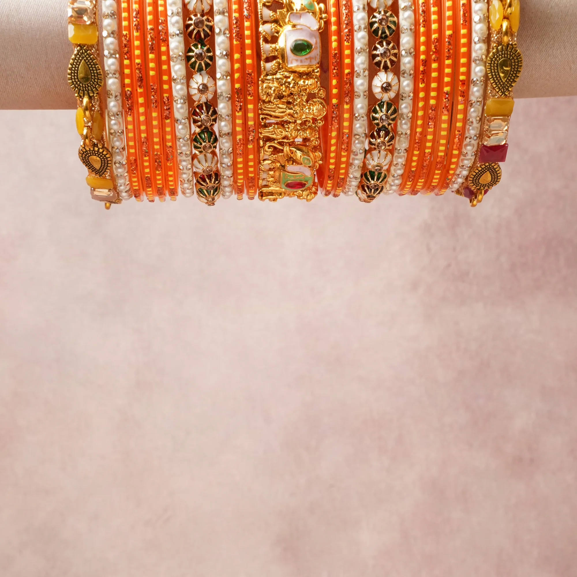A grounding Saffron Orange forms the heart of the set, while touches of Antique Gold, Ivory Pearl, Emerald Green, Crimson Red, Rose Pink, Amber Yellow add charm.