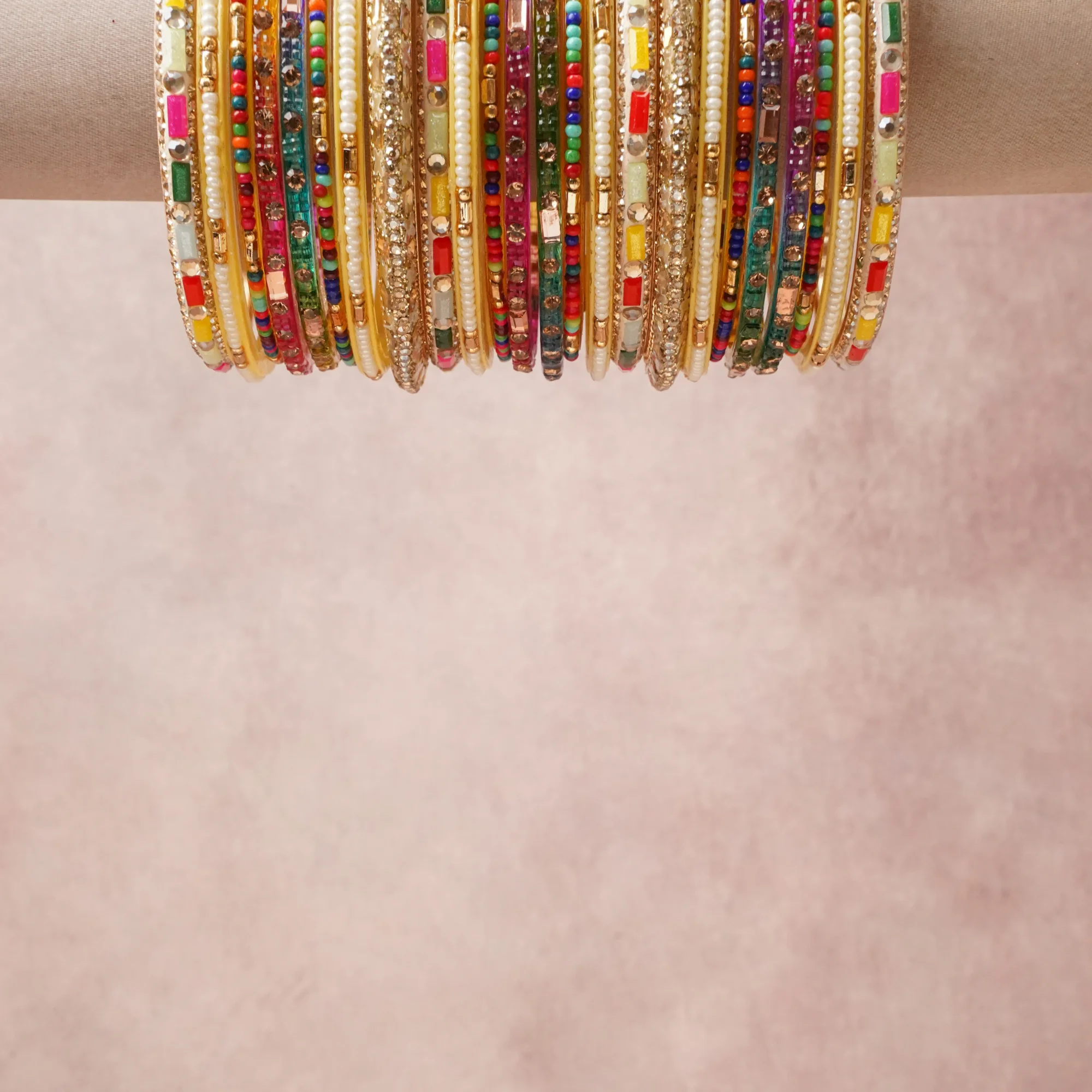 A grounding Gold forms the heart of the set, while touches of Gold, Cream, White, Ruby Red, Emerald Green, Sapphire Blue, Citrine Yellow, Tangerine Orange, Hot Pink add charm.