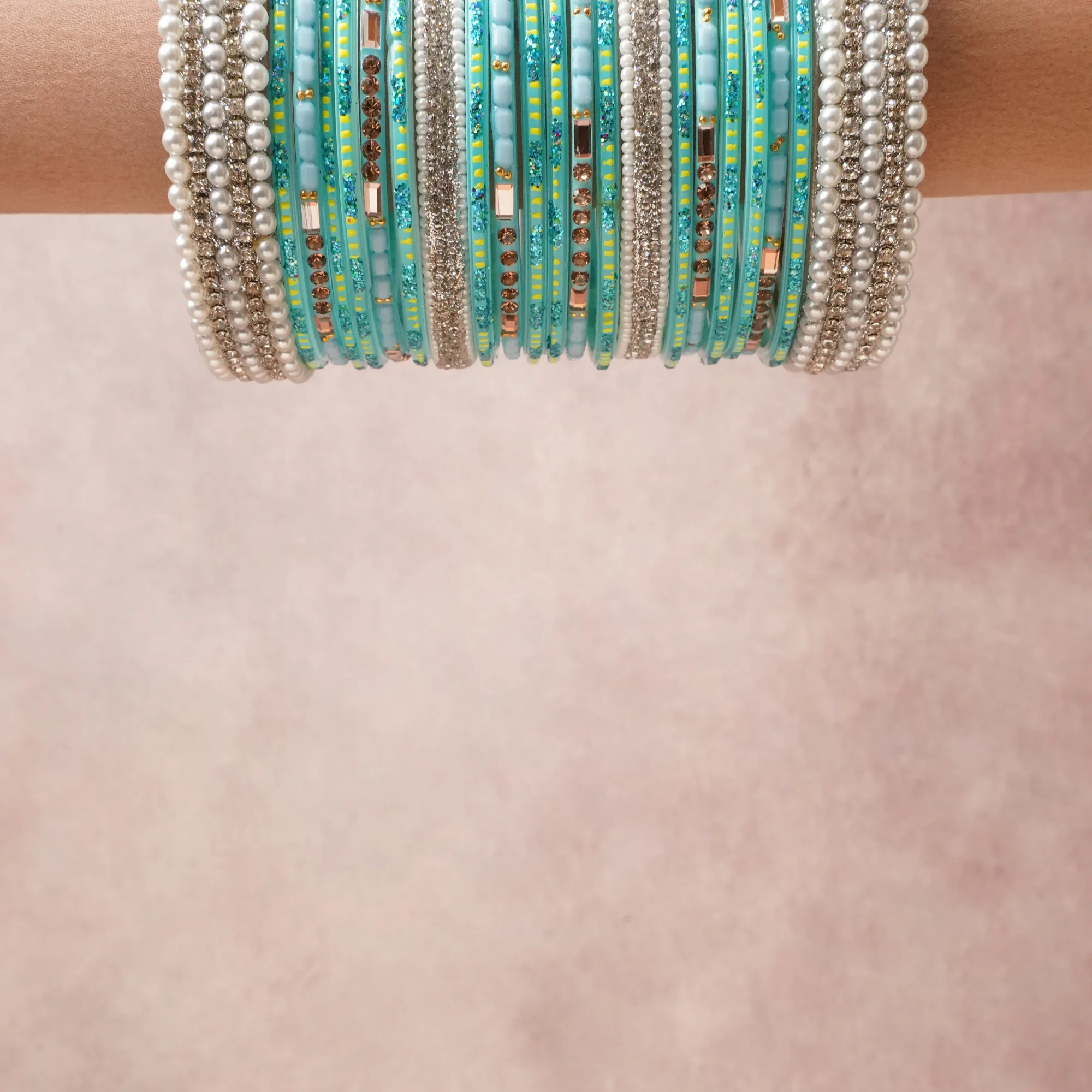 A grounding Aqua Blue forms the heart of the set, while touches of Pearl White, Silver, Chartreuse Yellow, Bronze, Pale Rose, Teal Glitter add charm.