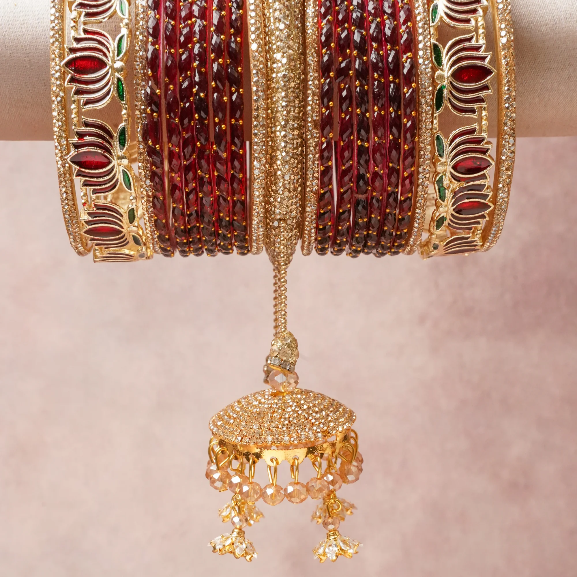 A majestic Deep Burgundy set, complemented by Scarlet Red, Emerald Green, Clear Crystal featuring Gold-toned Metal Alloy, Glass, Crystal, Rhinestone, Enamel.