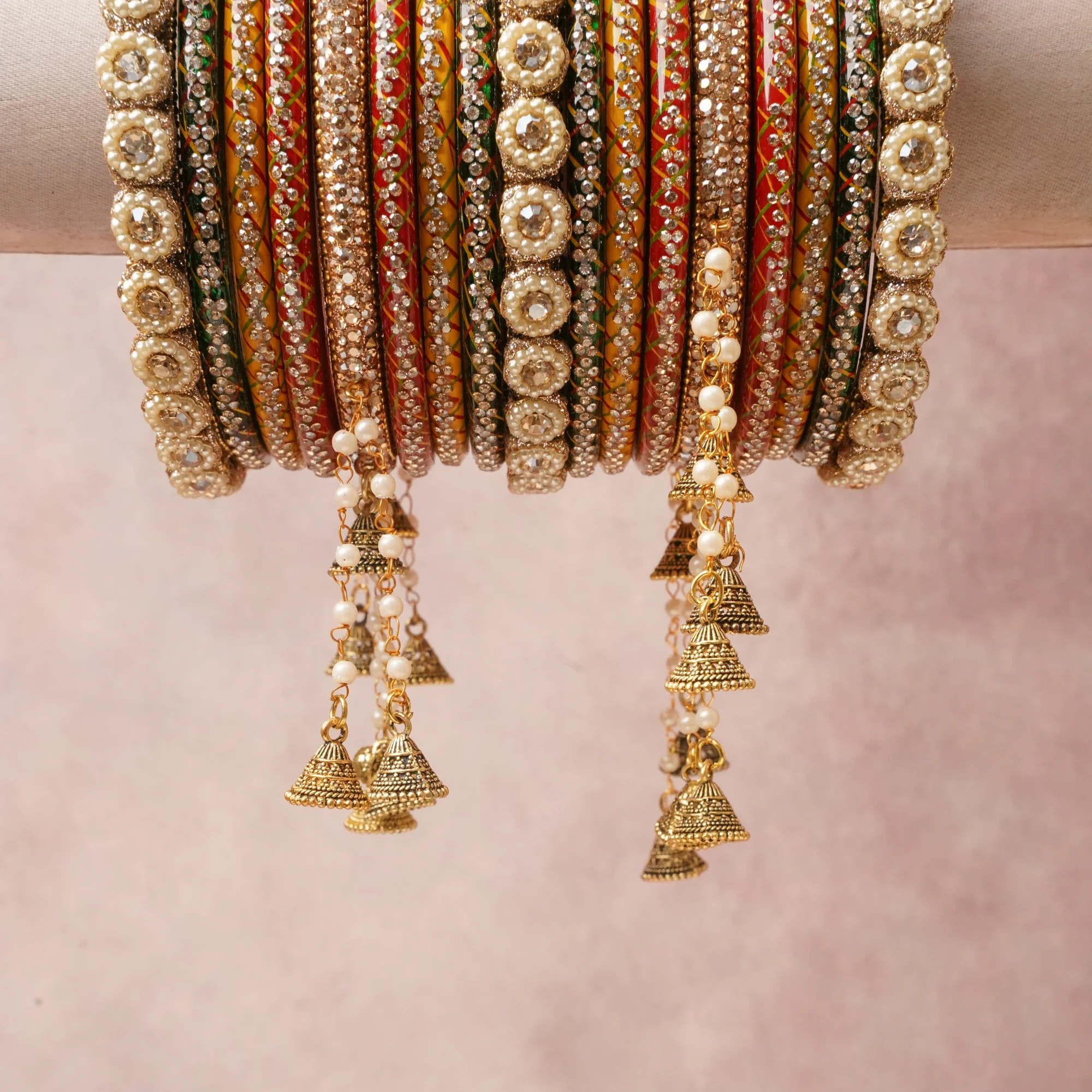 A majestic Deep Scarlet Red set, complemented by Creamy Ivory, Clear Diamond, Bright Gold featuring Lacquered Resin, Brass Alloy, Faux Pearls, Rhinestone Crystals.