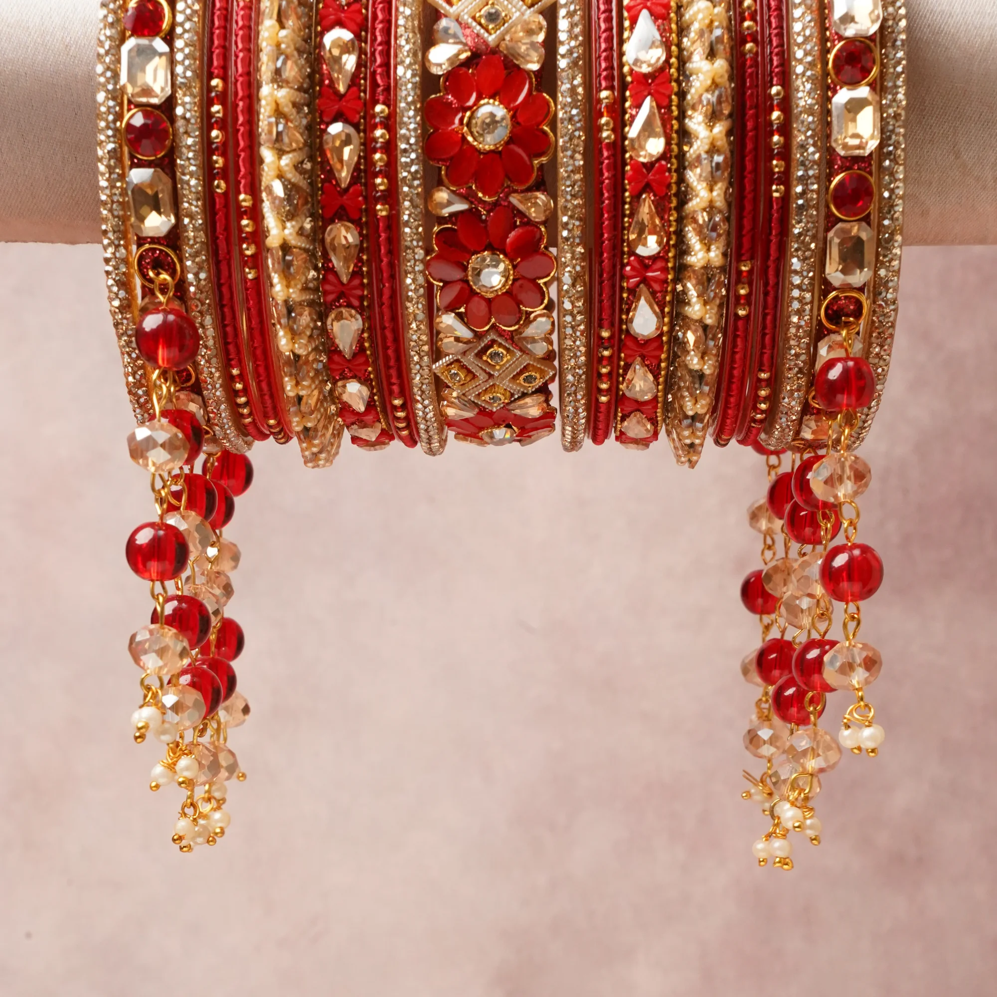 A majestic Crimson Red set, complemented by Gold, Champagne, White featuring Gold-toned Alloy, Glass Crystals (Red, Champagne, Clear), Imitation Pearls, Silk Thread, Micro Seed Beads (Gold, White).