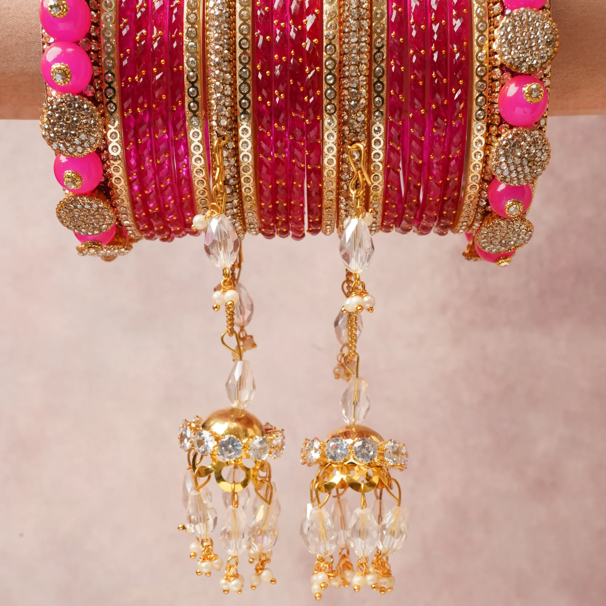 A majestic deep pink set, complemented by Rose Gold, Gold featuring Glass, Gold-toned Metal, Rhinestones, Acrylic, Pearls, Faceted Crystal.