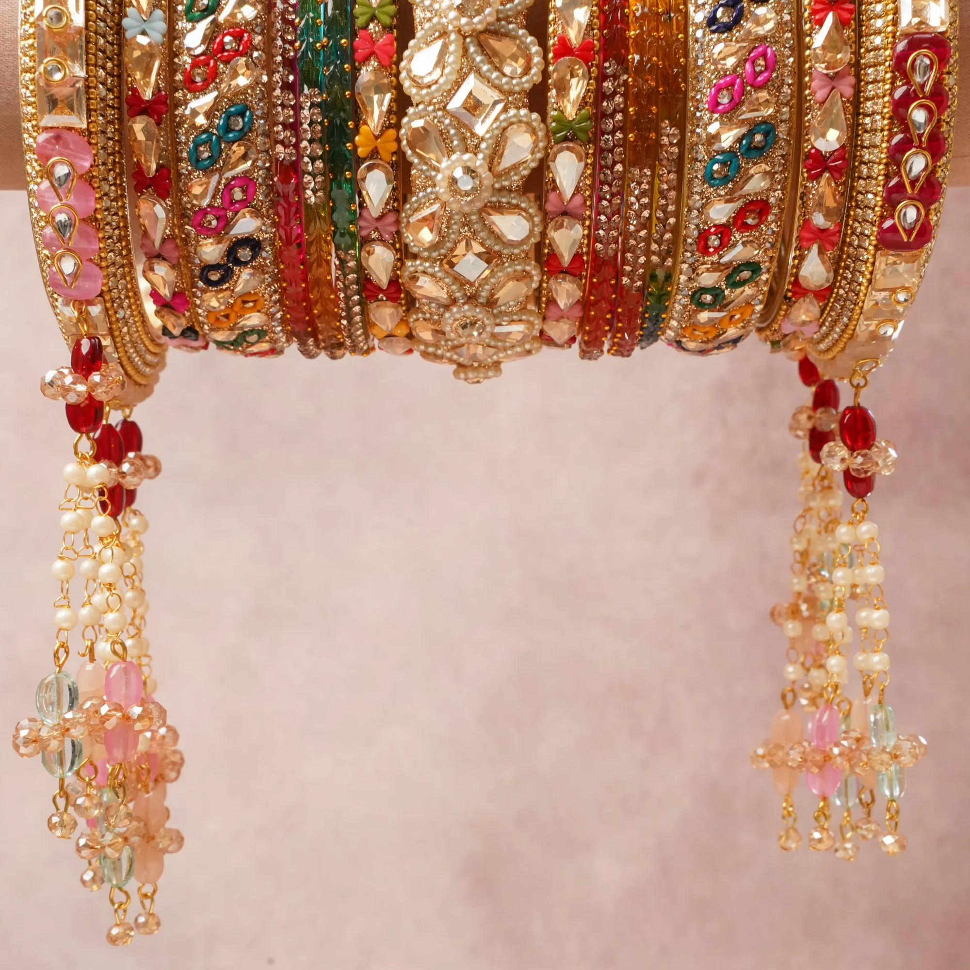 A majestic Multi colour set, complemented by Clear Crystal, Pearl White, Champagne, Rose Pink, Fuchsia, Ruby Red, Deep Crimson, Emerald Green, Teal, Sky Blue, Navy Blue, Topaz Yellow, Orange, Violet, Mint Green featuring Gold-toned Metal, Glass, Crys.tals, Faux Pearls, Enamel, Kundan (Simulated).