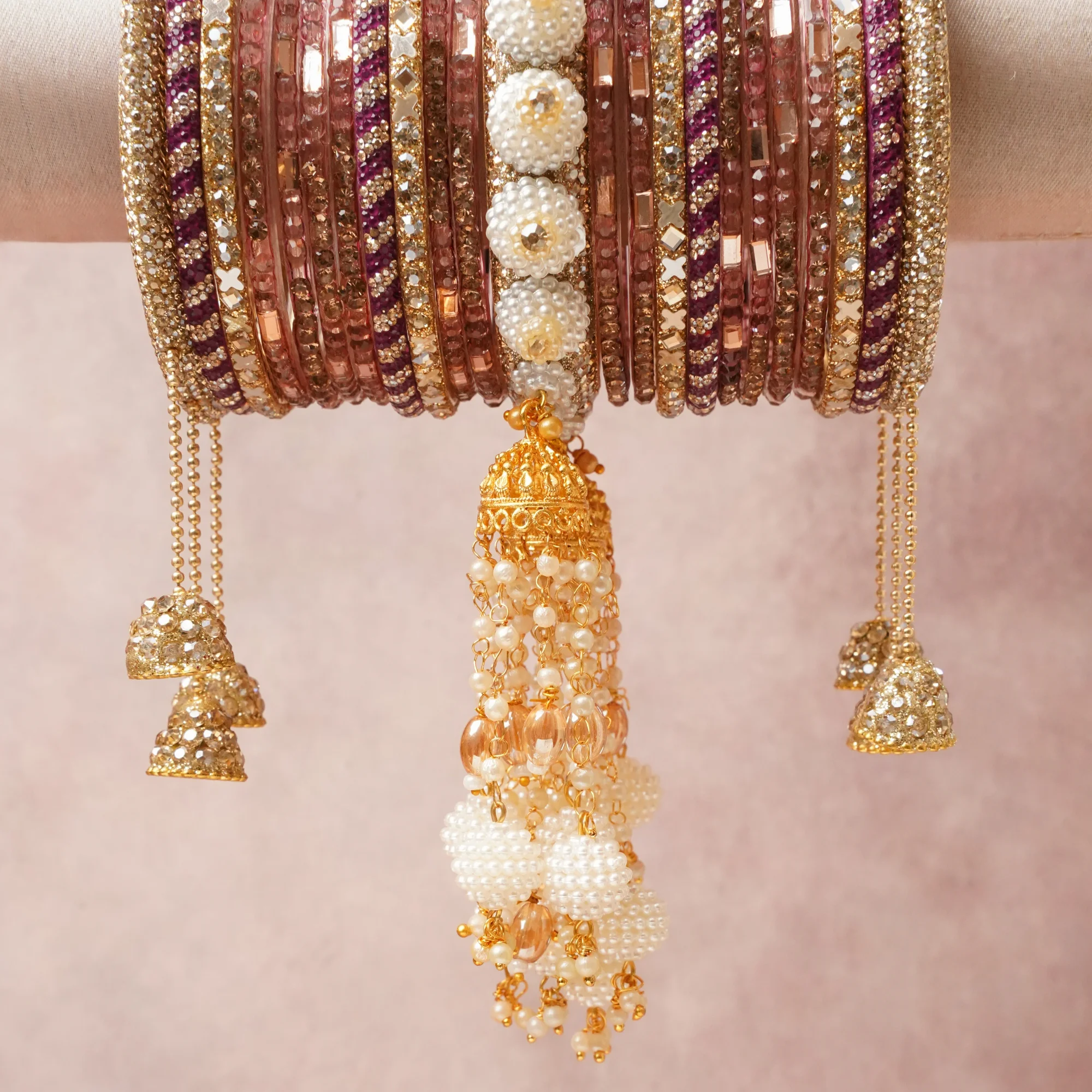 A majestic Plum set, complemented by Cream featuring Glass, Metal Alloy, Faux Pearls, Crystals, Textile Thread. Rich, ceremonial, and designed to be passed through generations.