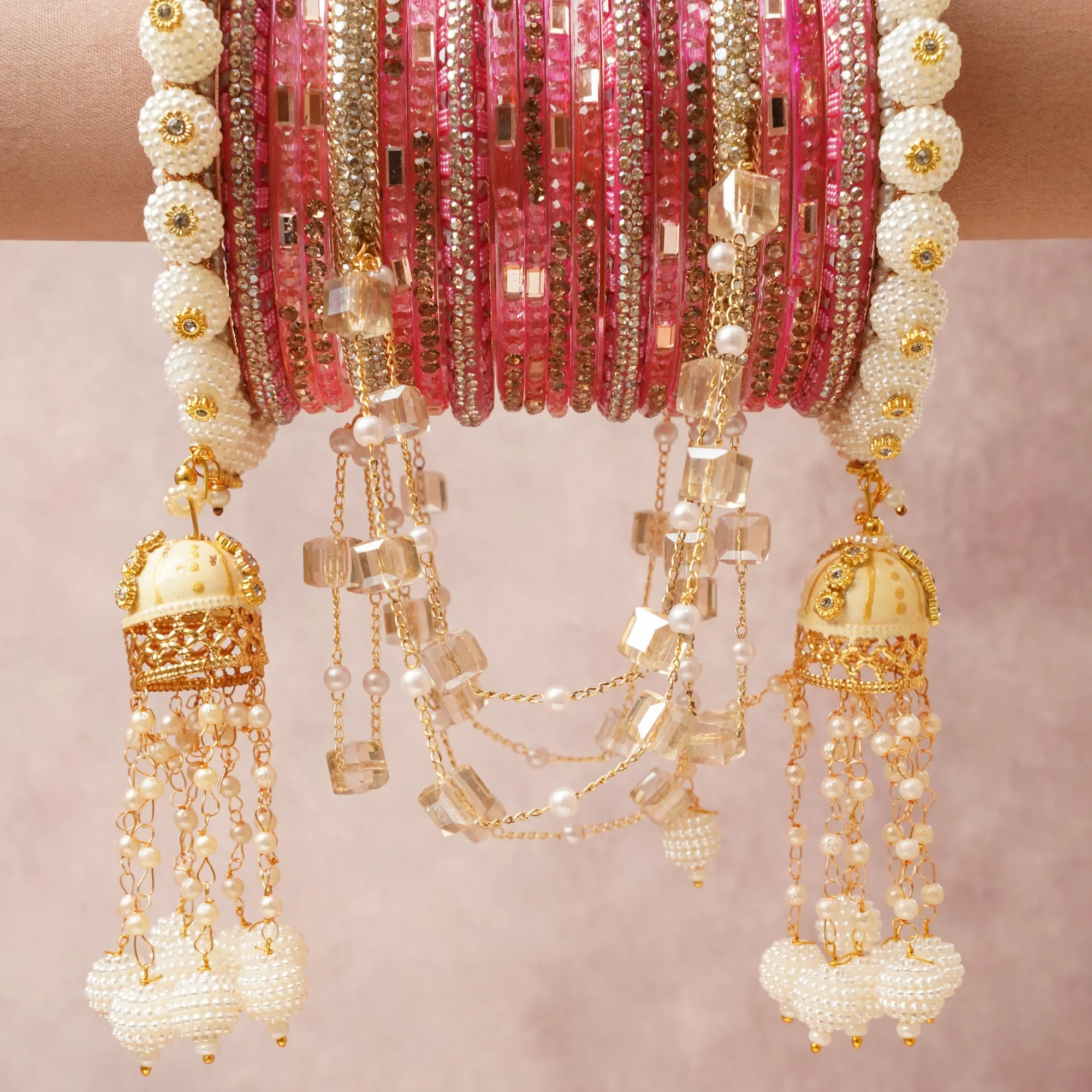 A majestic Fuchsia set, complemented by Clear featuring Glass, Acrylic, Gold-Toned Metal, Faux Pearls, Rhinestones, Enamel. Rich, ceremonial, and designed to be passed through generations.