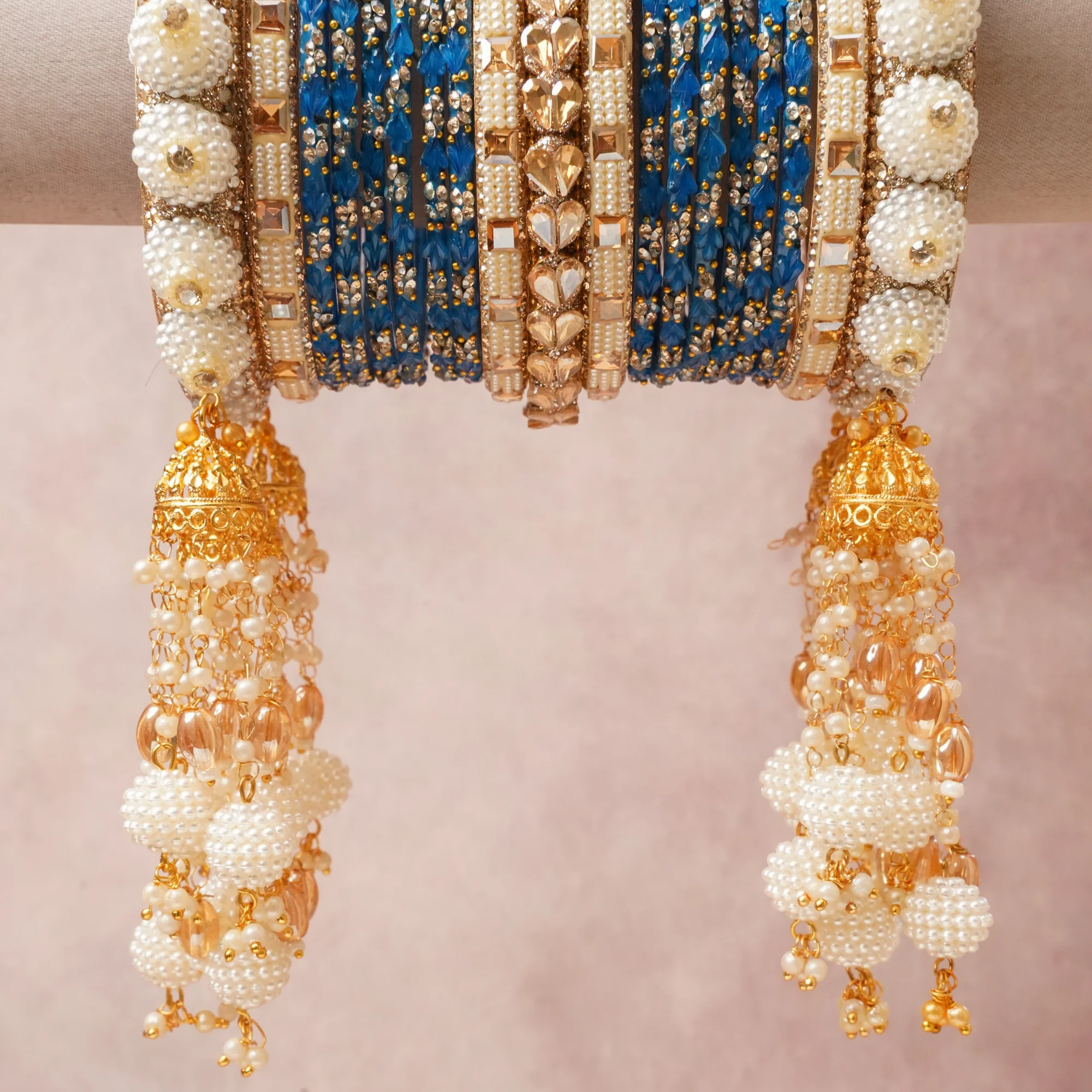 A majestic Teal Blue set, complemented by Gold, Cream, Clear, Amber featuring Gold-Plated Metal, Faux Pearls, Glass Crystals, Enamel, Glass Beads.