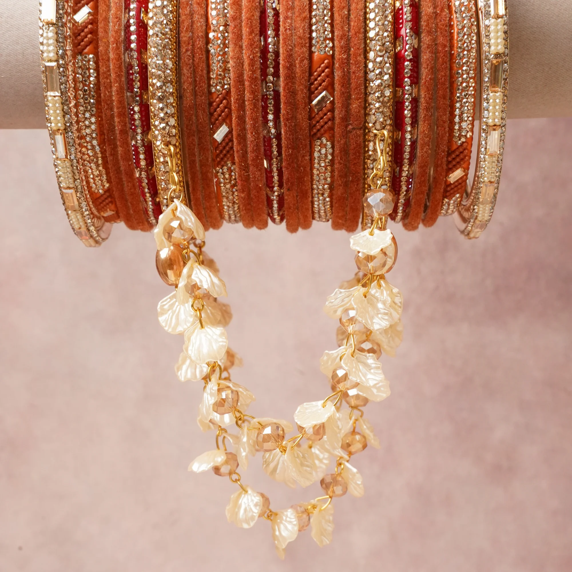 A majestic Sienna Brown set, complemented by Clear Crystal, Gold Tone, Champagne, Pearlescent White featuring Velvet, Metal Alloy, Glass Rhinestones, Iridescent Acrylic, Faceted Acrylic, Lacquer, Faux Pearl.