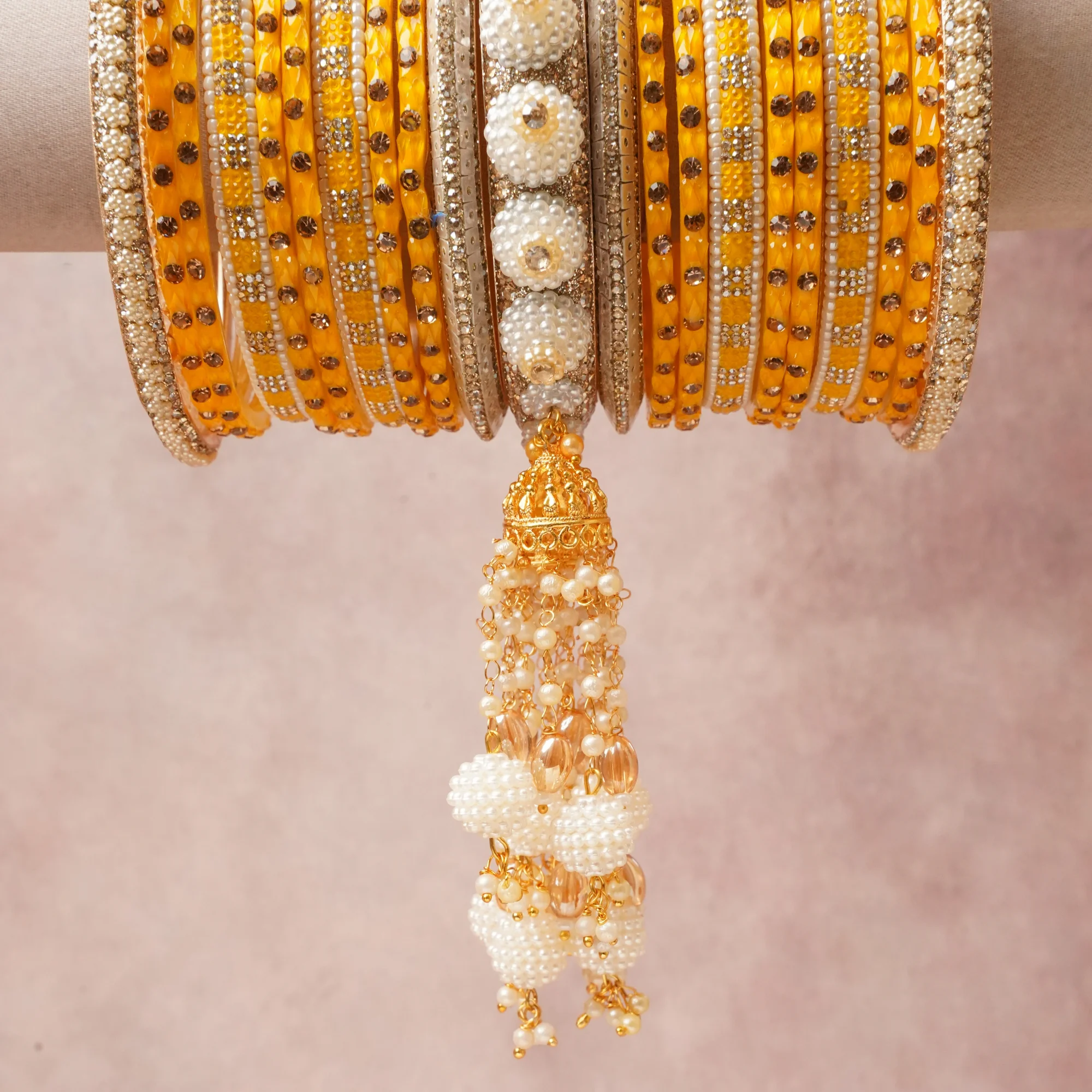 A majestic Marigold Yellow set, complemented by Ivory, Gold, Crystal Clear featuring Resin, Faux Pearl, Crystal, Gold-Plated Metal. Rich, ceremonial, and designed to be passed through generations.