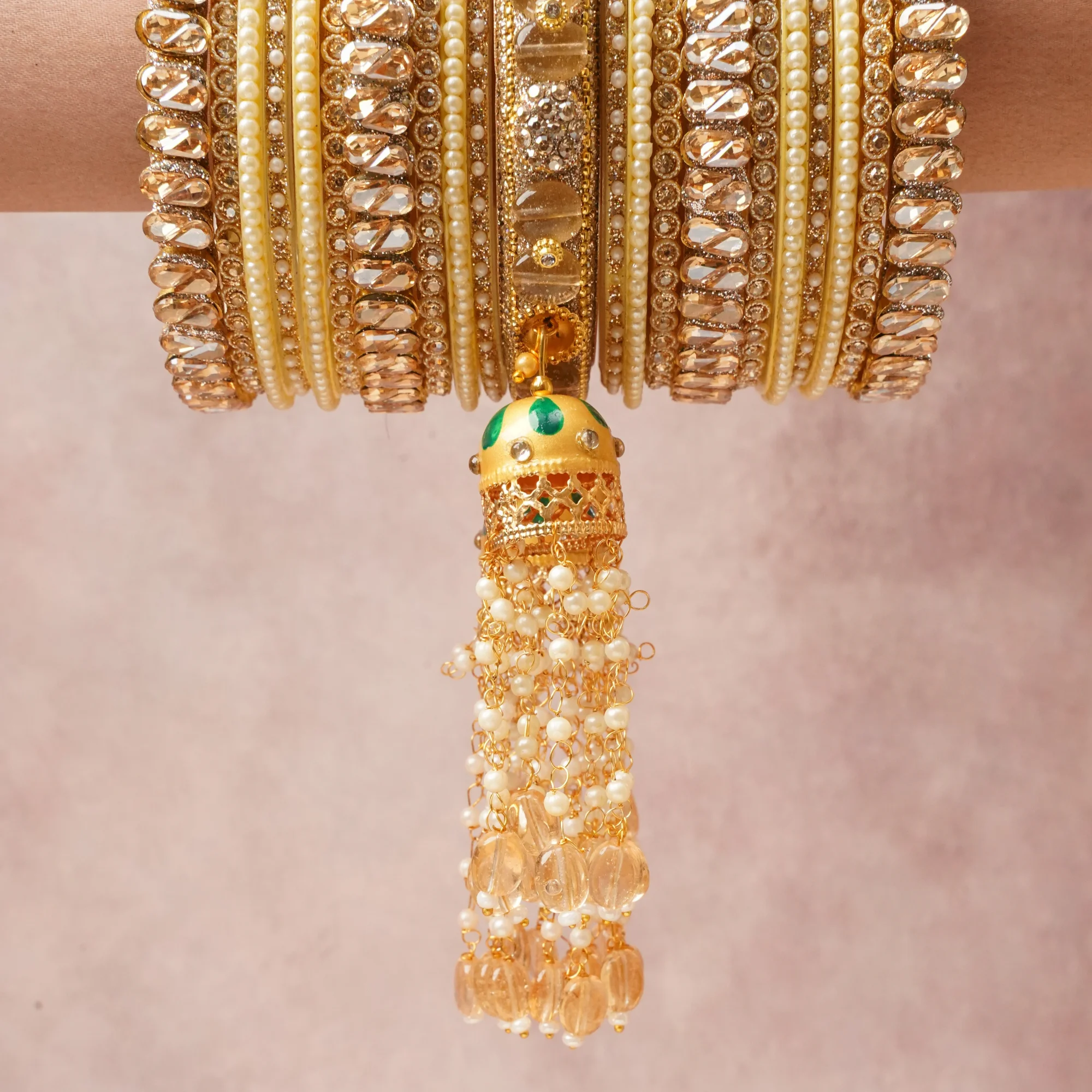 A majestic Champagne Gold set, complemented by Clear Crystal, Ivory Pearl, Emerald Green featuring Gold-toned Metal Alloy, Champagne Faceted Crystals, Clear Faceted Crystals, Simulated Pearls, Enamel.