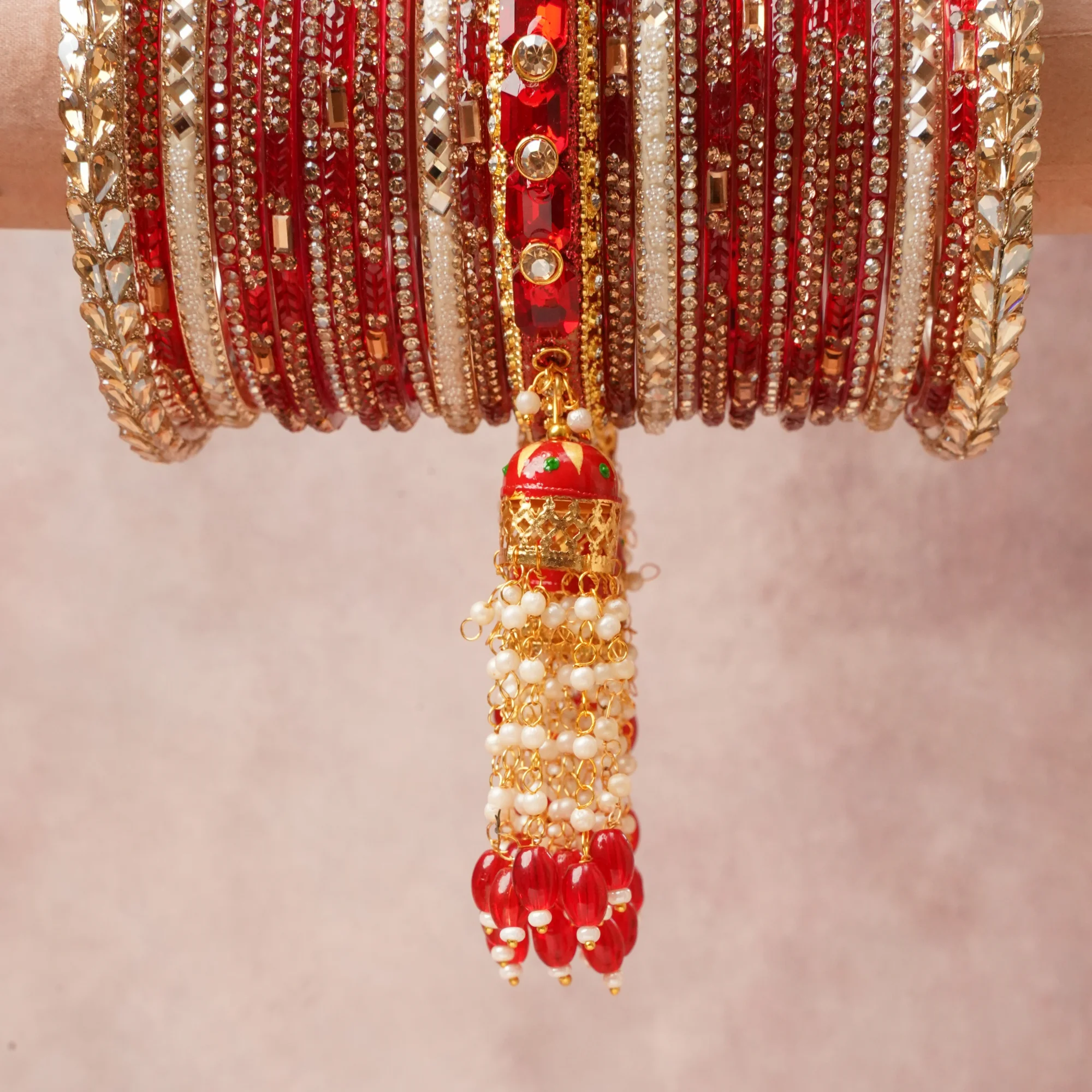 A majestic Deep Crimson set, complemented by Crystal White, Metallic Gold, Pearly Cream, Emerald Green featuring Glass, Rhinestones, Gold-toned Alloy, Pearls, Enamel, Red Crystals, Red Glass Beads.