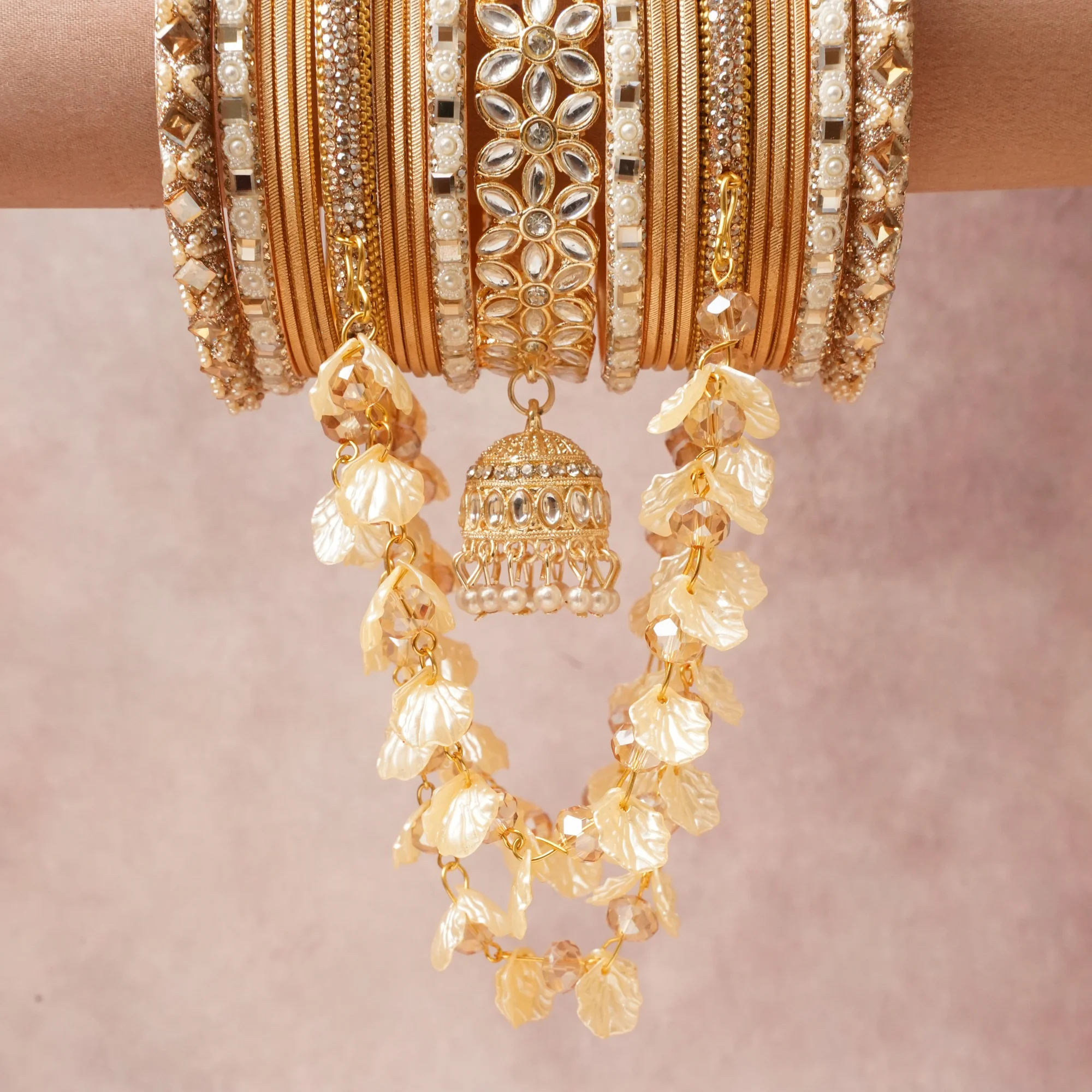 A majestic Champagne Gold set, complemented by Brilliant White, Lustrous Ivory, Warm Translucent Taupe featuring Gold-toned Alloy, Kundan Glass, Cubic Zirconia, Imitation Pearl, Resin/Acrylic, Glass Beads, Seed Beads.