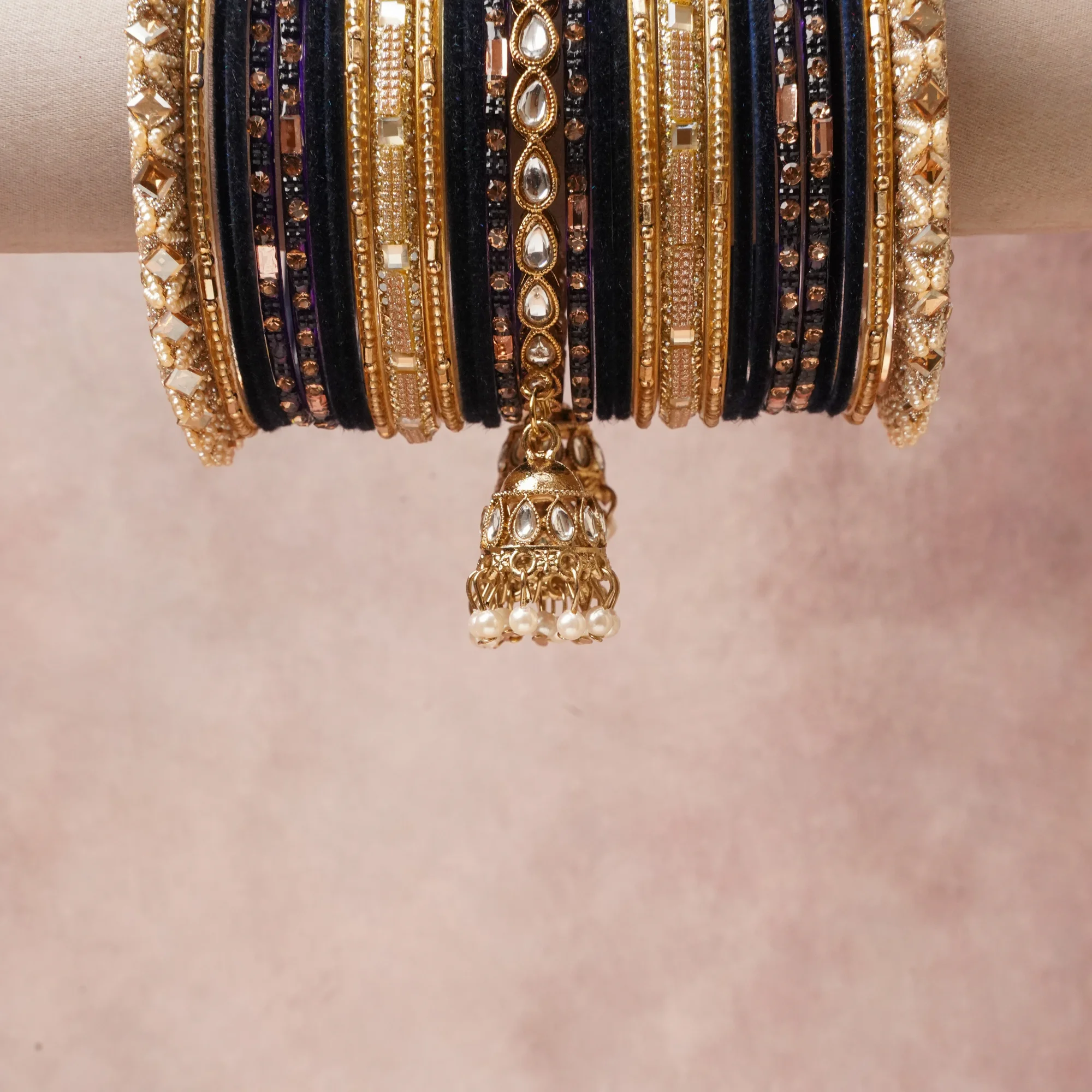 A majestic Navy Blue set, complemented by Clear, Cream, Rose Gold featuring Gold-toned Metal, Glass, Crystal, Imitation Pearl, Velvet/Fabric.