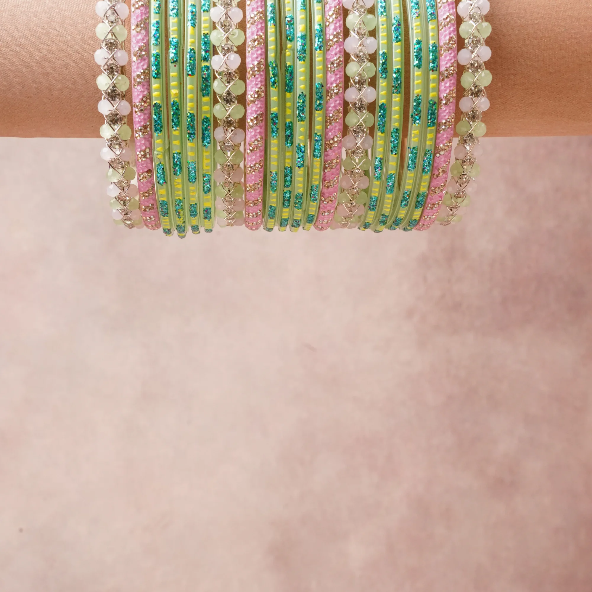 A commanding Mint Green anchors this beautiful set, enriched with accents of Opalescent White, Clear Rhinestone, Aqua Glitter, Gold that add depth and dimension.