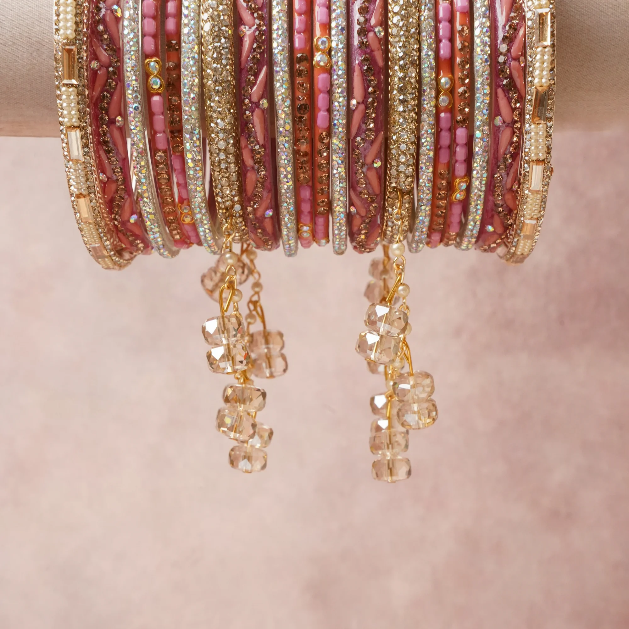 A commanding Deep Rose anchors this beautiful set, enriched with accents of Gold, Silver, Iridescent Crystal that add depth and dimension.