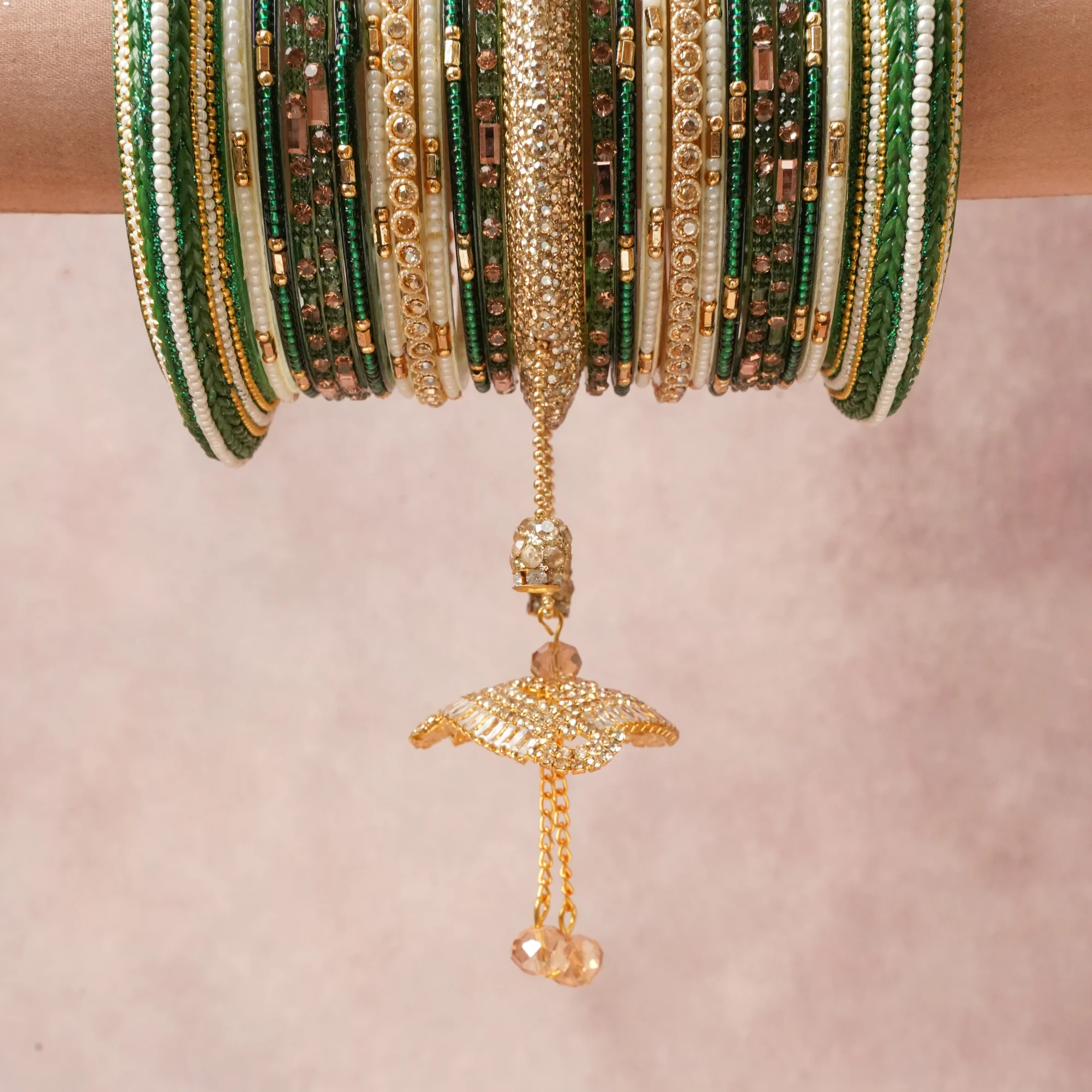 Featuring a striking composition of Gold-Toned Metal Alloy, Glass, Acrylic, Silk Thread, Cubic .Zirconia, Simulated Pearl, Glass Seed Beads, Faceted Crystal, this set carries intricate craftsmanship and strong presence. Grand in form, it is created for moments that deserve to be marked.