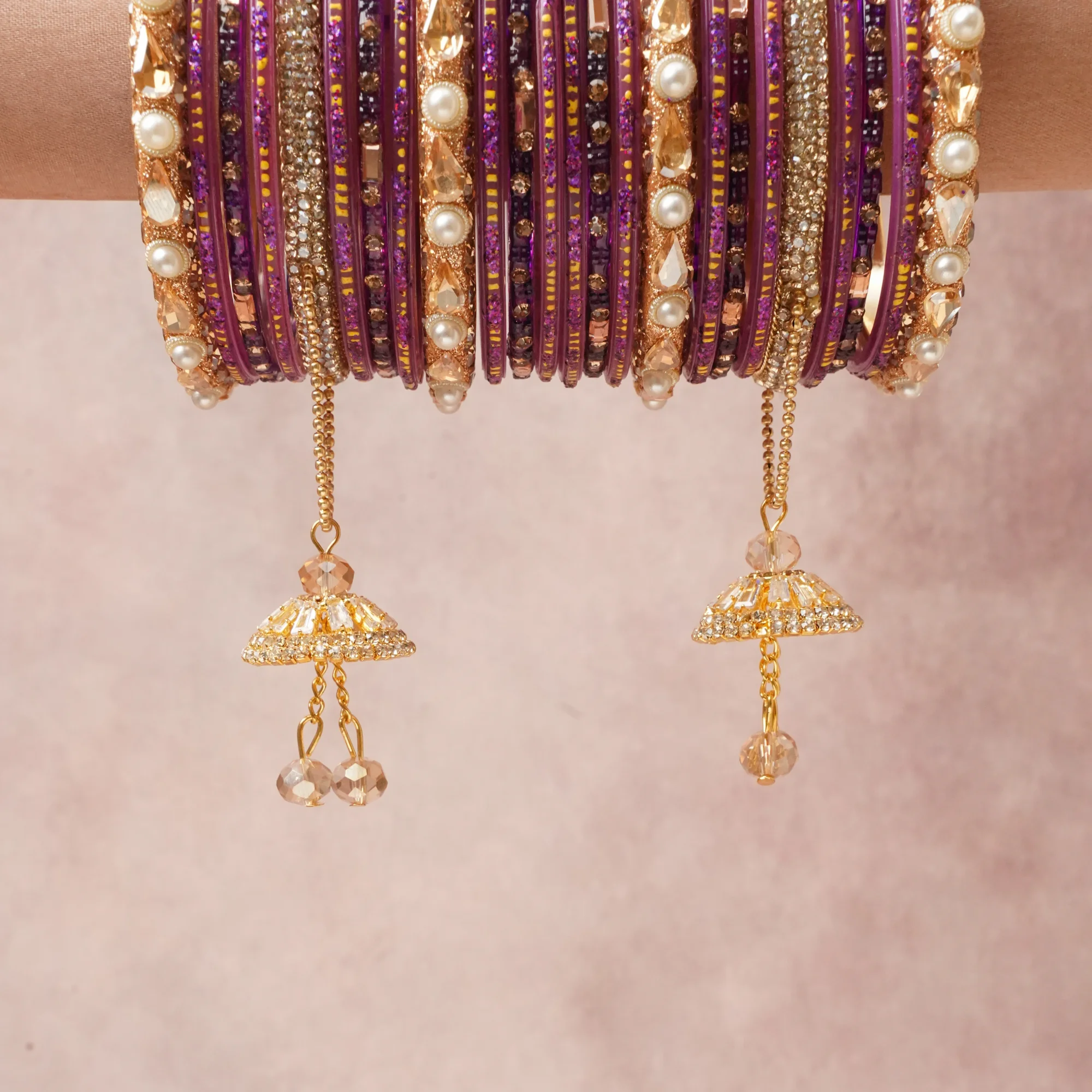 A commanding Amethyst Purple anchors this beautiful set, enriched with accents of Rich Gold, Cream Pearl, Champagne Crystal, Clear Crystal, Smoky Taupe Crystal that add depth and dimension.
