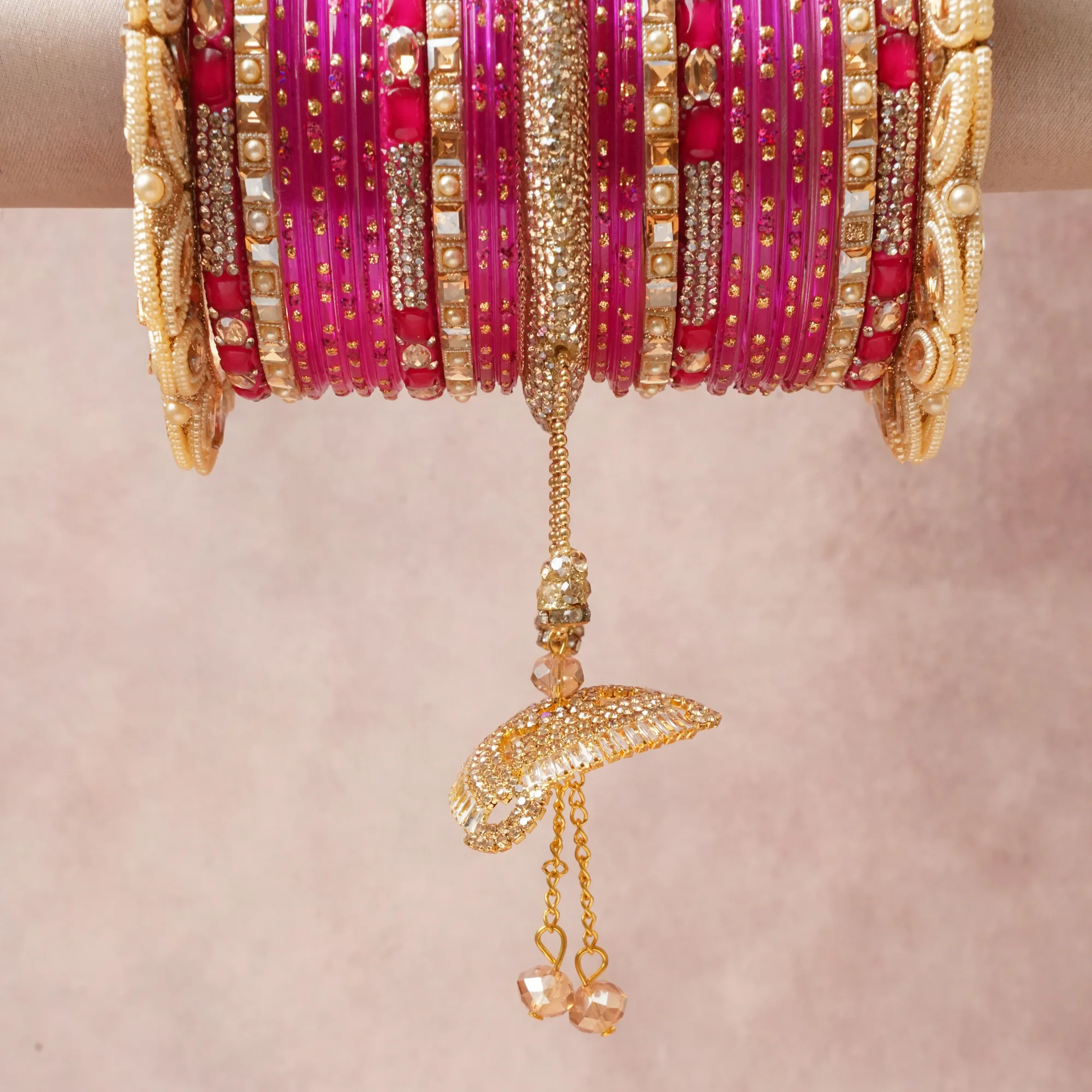 A commanding Fuchsia anchors this beautiful set, enriched with accents of Gold, Clear, Cream, Ruby Red, Amber that add depth and dimension.
