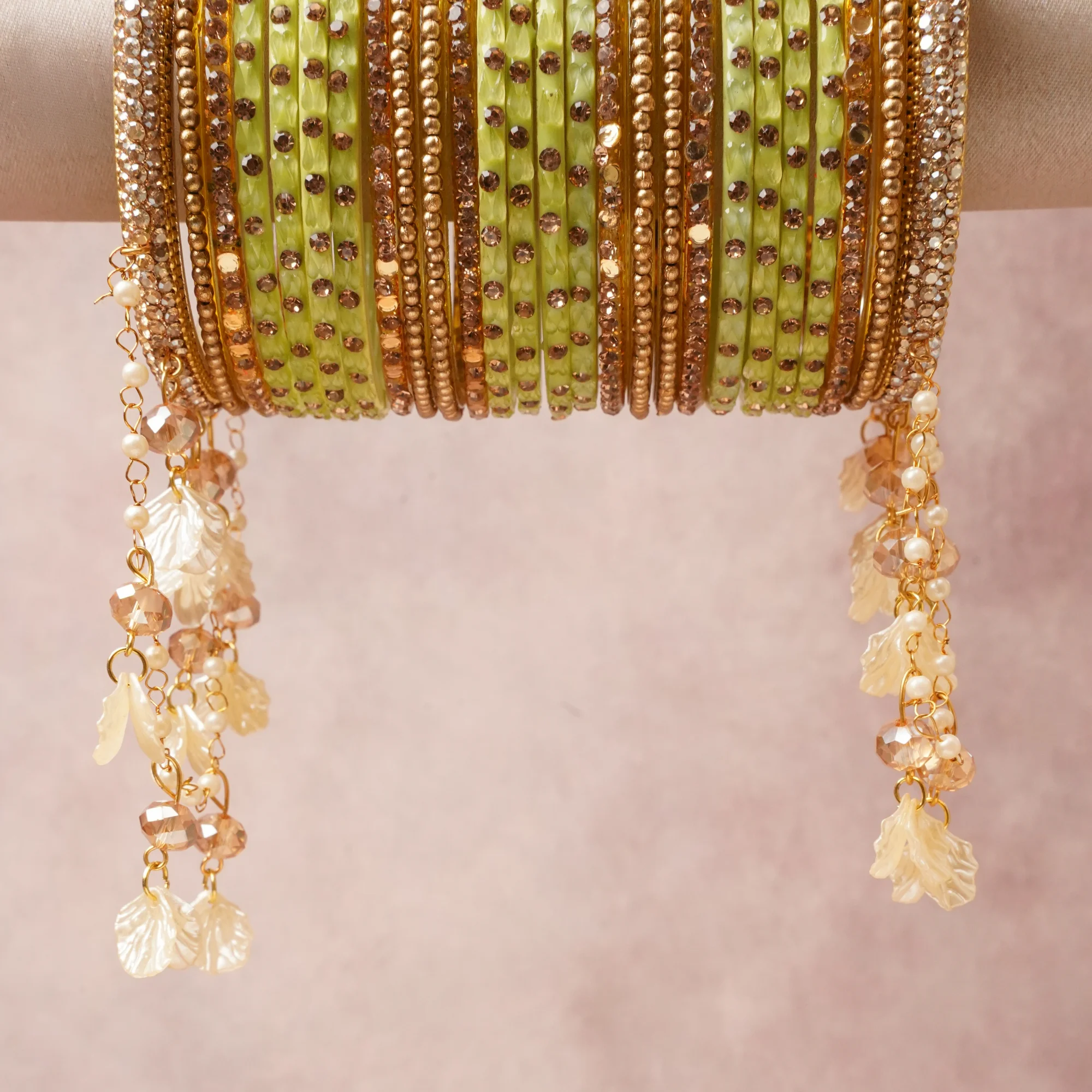 A commanding Green anchors this beautiful set, enriched with accents of Polished Gold, Champagne Rhinestone, Warm Gold, Clear Crystal, Champagne Crystal that add depth and dimension.