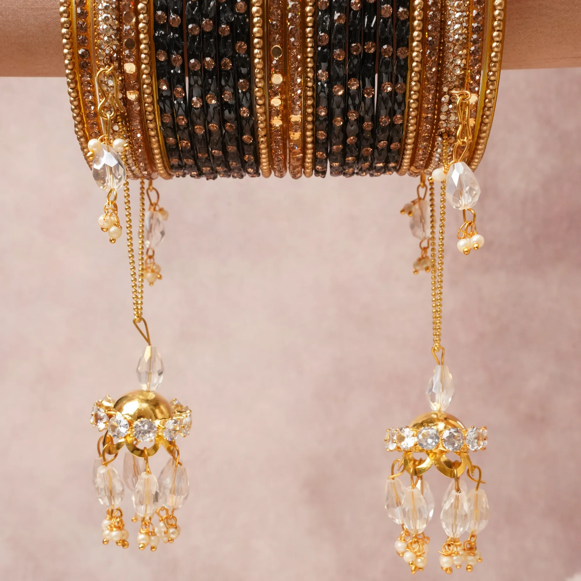 A commanding Black anchors this beautiful set, enriched with accents of Clear Crystal, Pearl White that add depth and dimension. Featuring a striking composition of Glass, Gold-toned Metal, Crystals, Simulated Pearls, this set carries intricate cr.aftsmanship and strong presence. Grand in form, it is created for moments that deserve to be marked. Know More