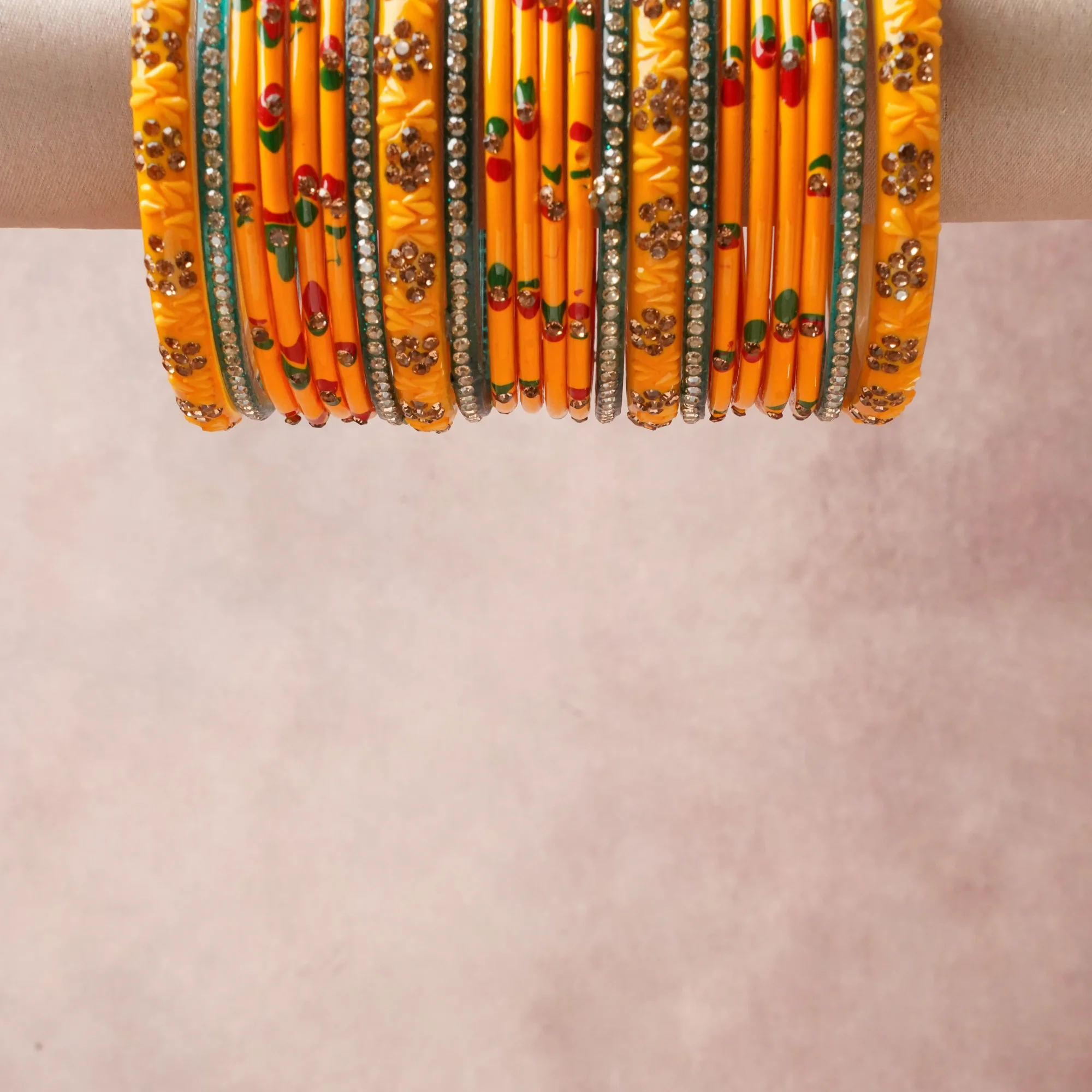 A commanding Marigold Yellow anchors this beautiful set, enriched with accents of Crimson Red, Emerald Green, Clear White, Gold, Teal that add depth and dimension.