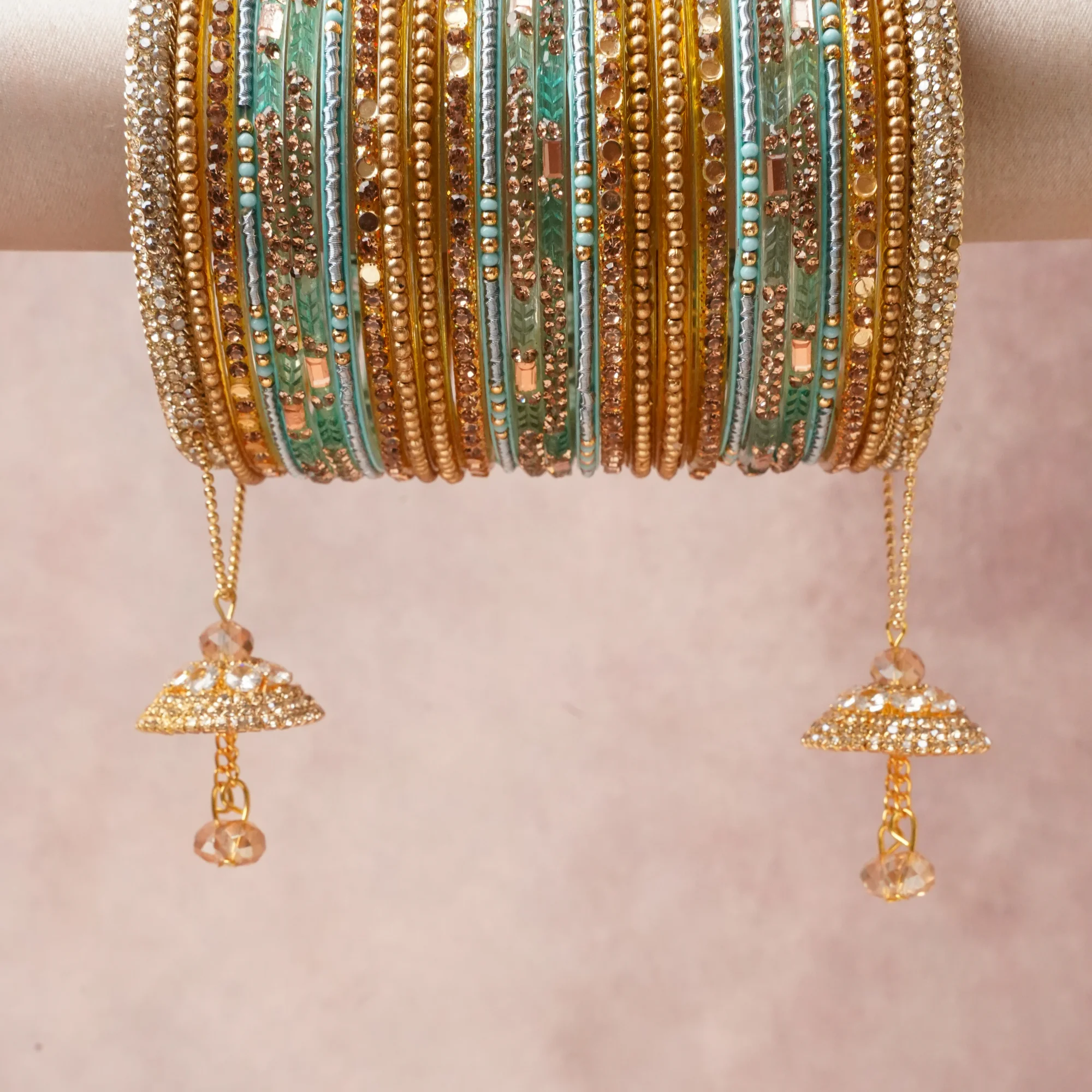 A commanding Gold anchors this beautiful set, enriched with accents of Teal, Dark Green, Champagne, Clear Crystal, Peach that add depth and dimension.