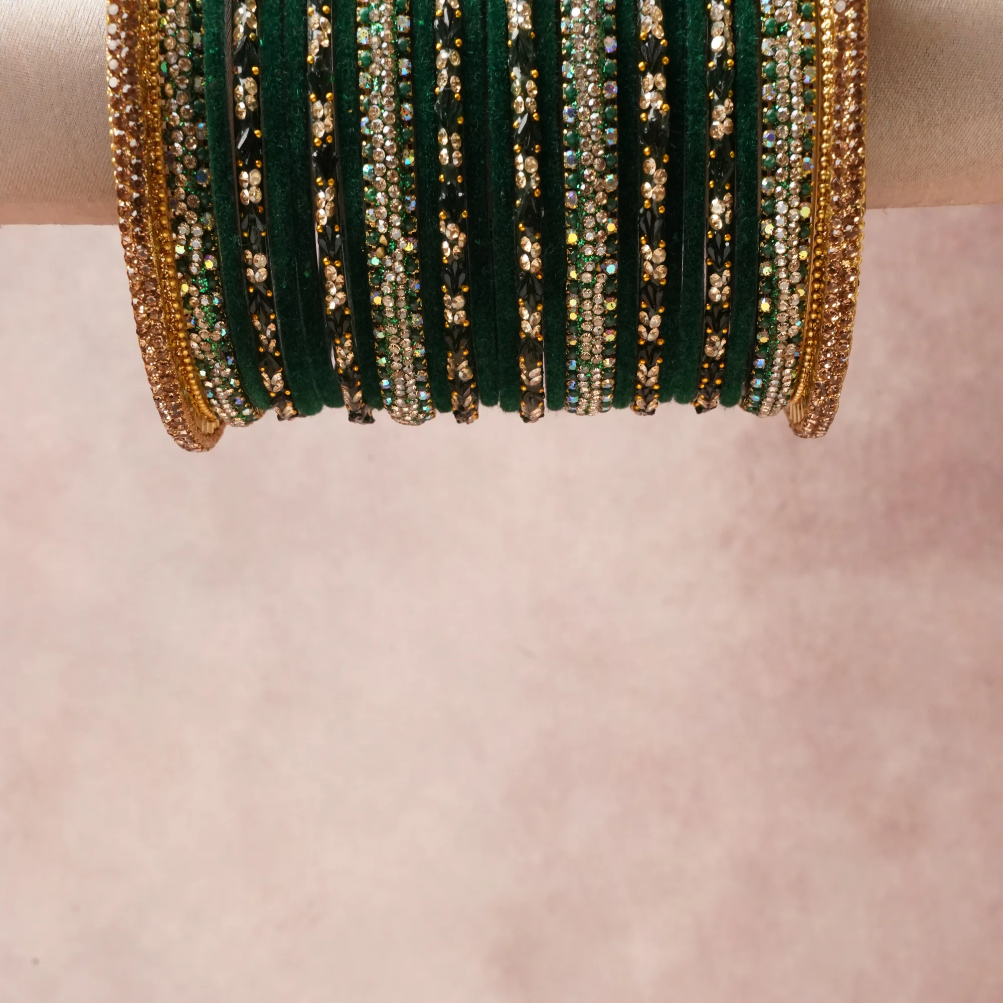A commanding Deep Forest Green anchors this beautiful set, enriched with accents of Clear Iridescent, Jet Black, Emerald Green that add depth and dimension.