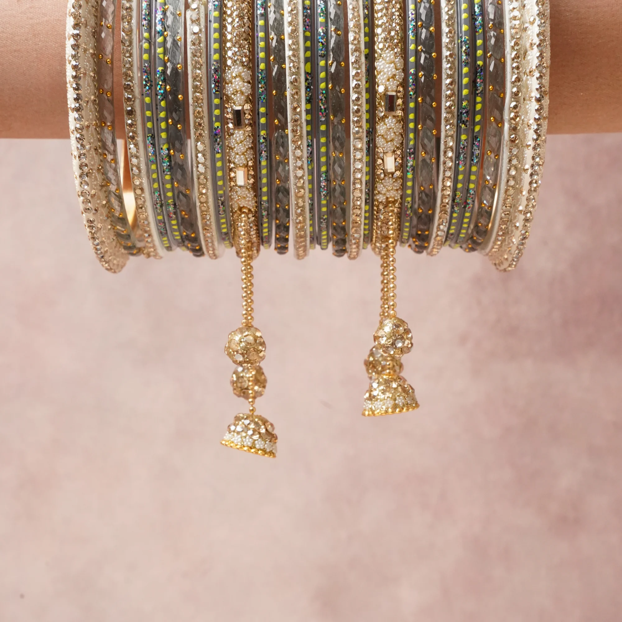 A commanding Champagne Gold anchors this beautiful set, enriched with accents of Clear Crystal, Iridescent Sparkle, Lime Green, Cream Pearl that add depth and dimension.