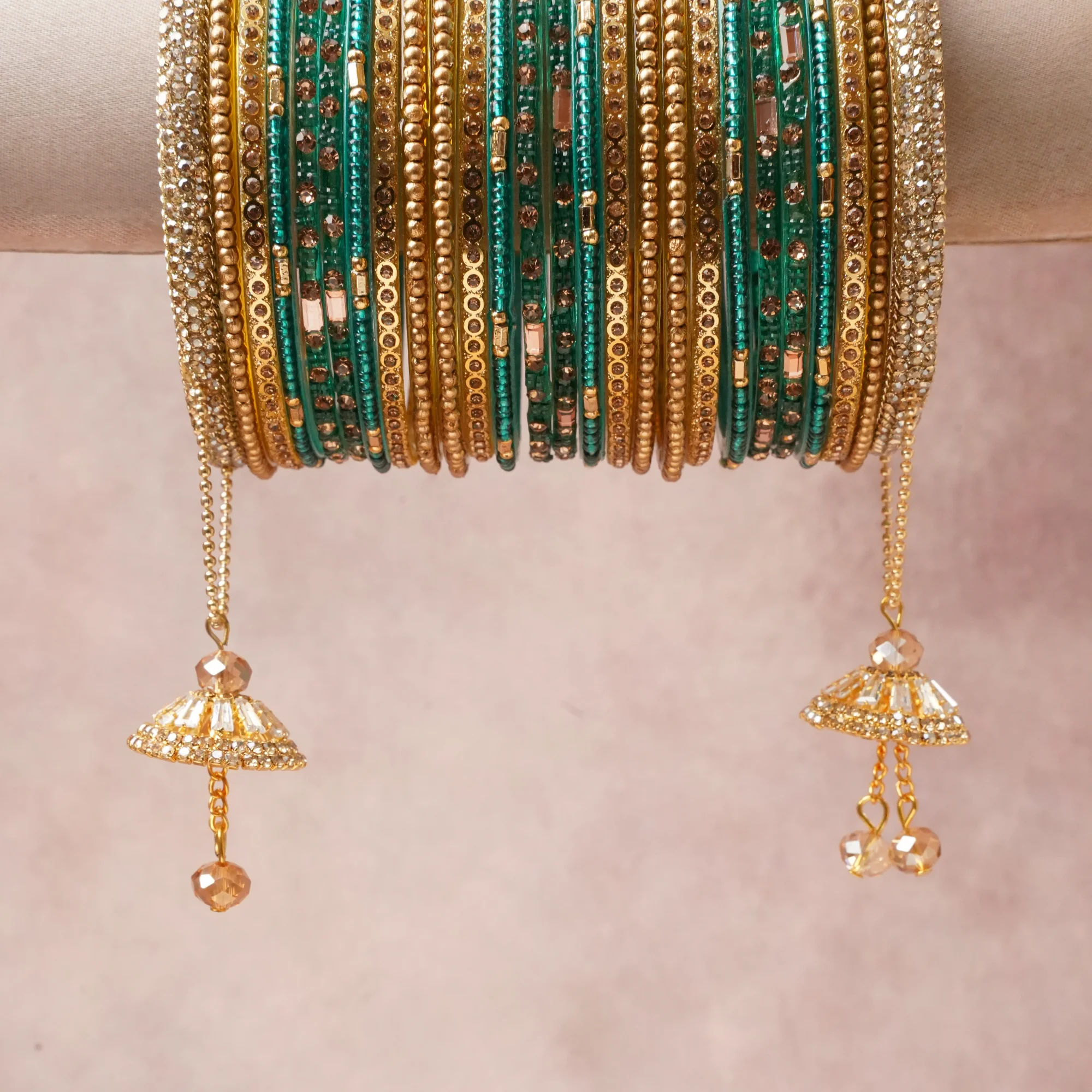 A commanding Gold anchors this beautiful set, enriched with accents of Teal, Champagne Crystal that add depth and dimension. Featuring a striking composition of Gold-toned Metal, Glass, Crystal, this set carries intricate craftsmanship and strong .presence. Grand in form, it is created for moments that deserve to be marked. Know More