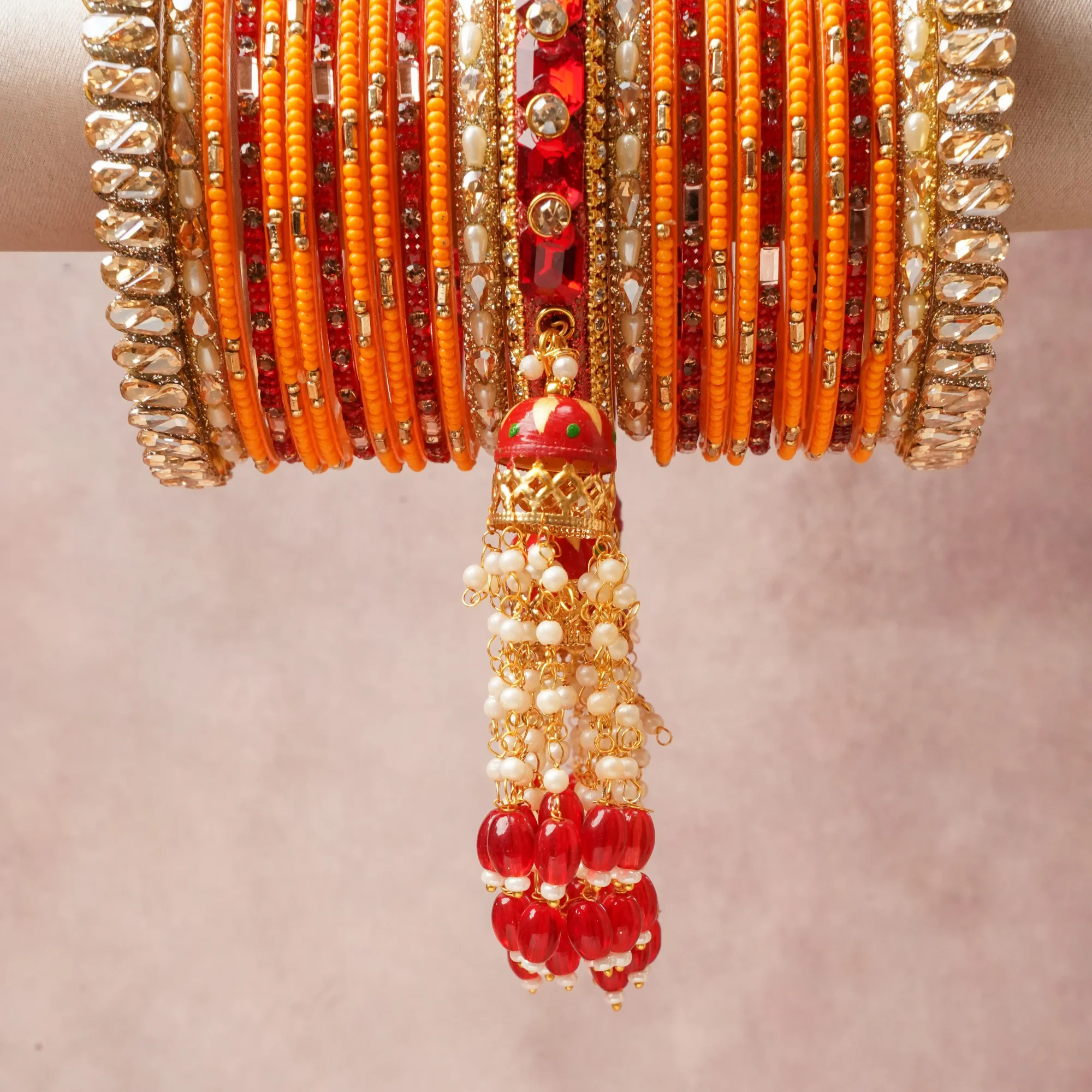 Featuring a striking composition of Gold-toned Metal Alloy, Lac Resin, Glass Beads, Mirrored G.lass, Faux Pearls, Glass Rhinestones, this set carries intricate craftsmanship and strong presence. Grand in form, it is created for moments that deserve to be marked.