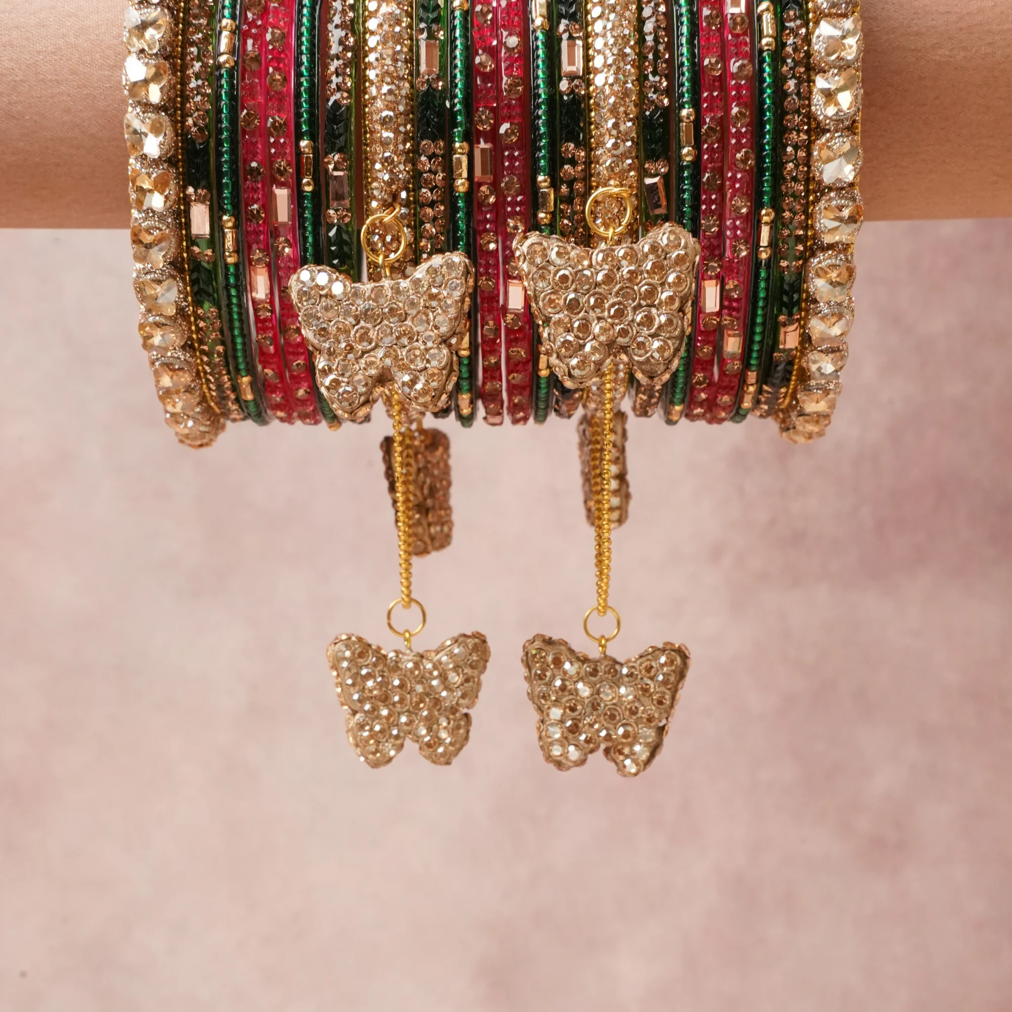 Featuring a striking composition of Glass (Bangles), Metal Alloy (Gold-toned settings, structural bangles, chains), Facet.ed Glass Crystals (Embellishments, charms), Seed Beads, this set carries intricate craftsmanship and strong presence. Grand in form, it is created for moments that deserve to be marked.