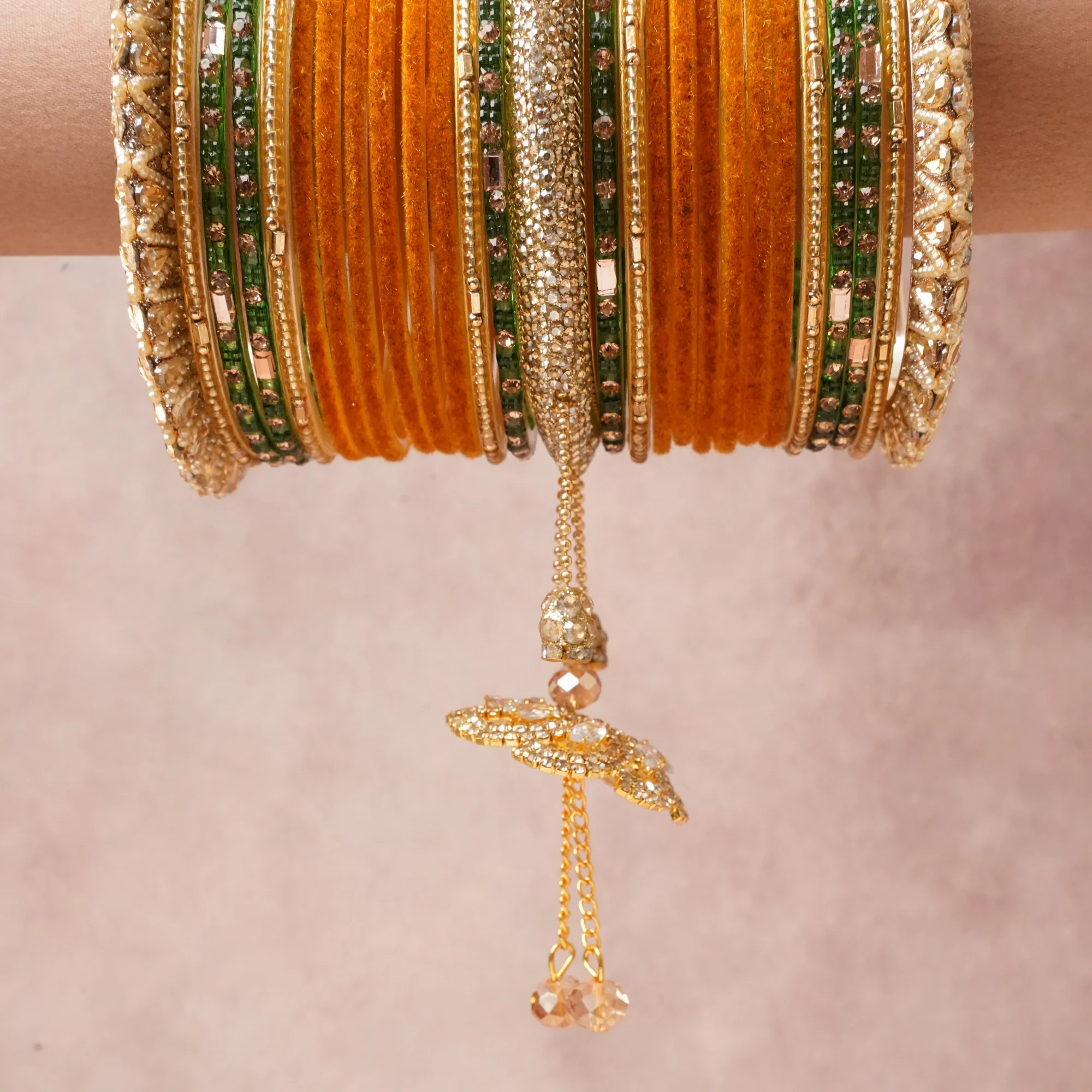 Featuring a striking composition of Velvet, Gold-toned Metal Alloy, Rhinestones, Glass Beads, F.aux Pearls, this set carries intricate craftsmanship and strong presence. Grand in form, it is created for moments that deserve to be marked.