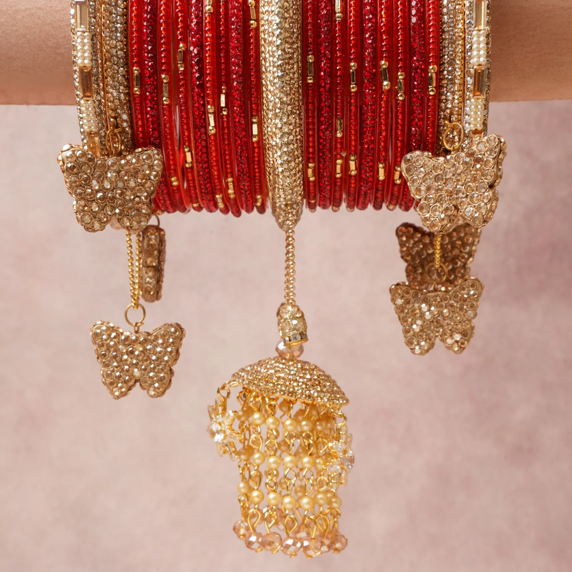 Featuring a striking composition of Glass, Gold-Plated Base Metal, Rhinestones, Faux Pearls, Cubic Zirconia, .this set carries intricate craftsmanship and strong presence. Grand in form, it is created for moments that deserve to be marked.