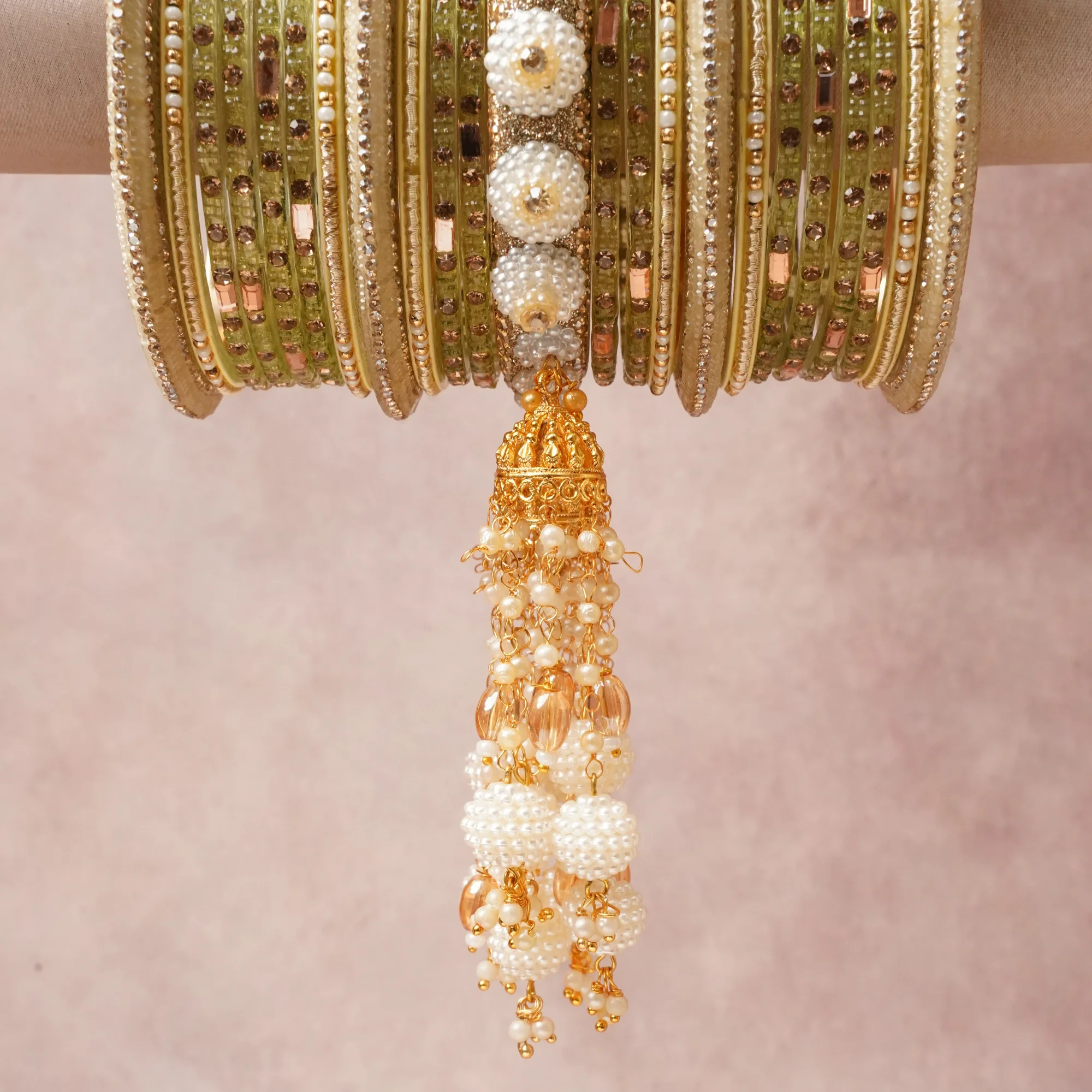 A commanding Muted Olive Green anchors this beautiful set, enriched with accents of Cream, Ivory, Gold, Clear that add depth and dimension.