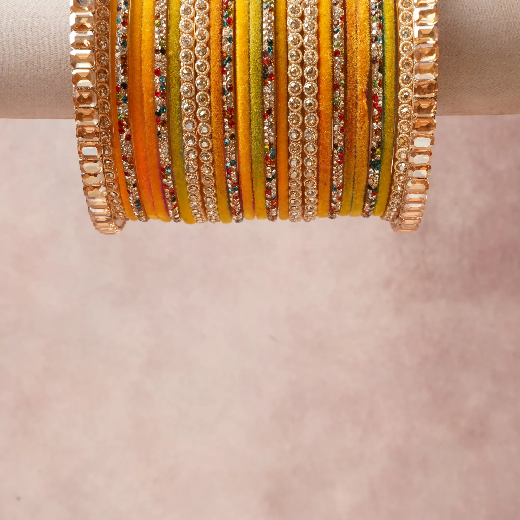 A commanding Marigold Yellow anchors this beautiful set, enriched with accents of Champagne, Multicolor that add depth and dimension. Featuring a striking composition of Velvet, Metal Alloy, Crystal, Rhinestone, this set carries intricate craftsma.nship and strong presence. Grand in form, it is created for moments that deserve to be marked. Know More