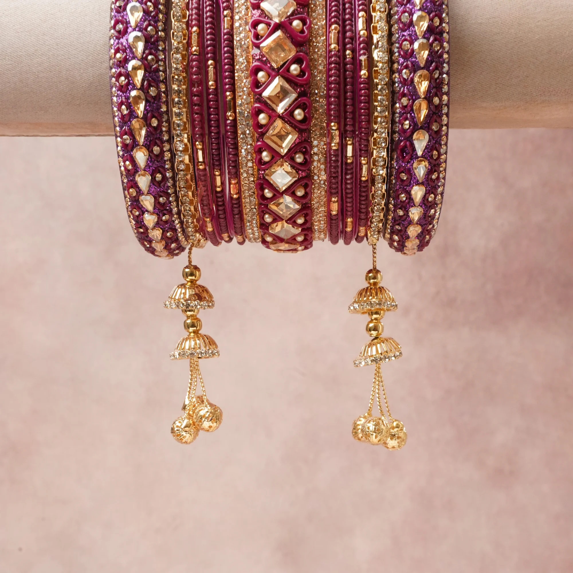 A commanding Deep Magenta anchors this beautiful set, enriched with accents of Gold, Clear, Pearl White that add depth and dimension.