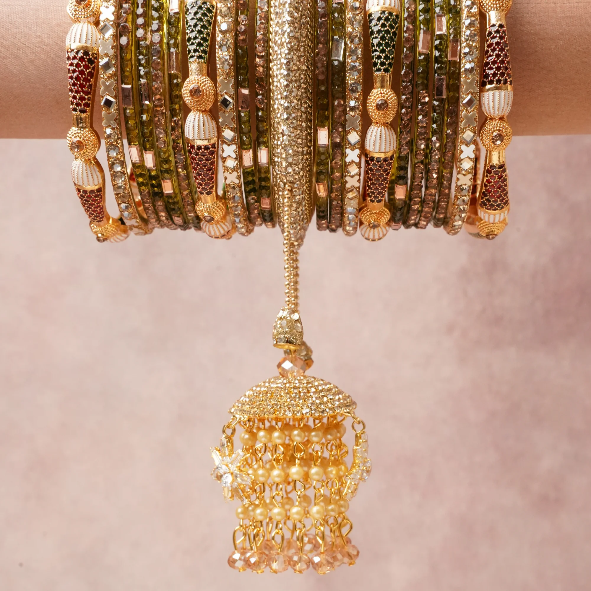 Featuring a striking composition of Gold-plated Brass, Glass, Cubic Zirconia,. Enamel, Faux Pearls, Faceted Glass, this set carries intricate craftsmanship and strong presence. Grand in form, it is created for moments that deserve to be marked.