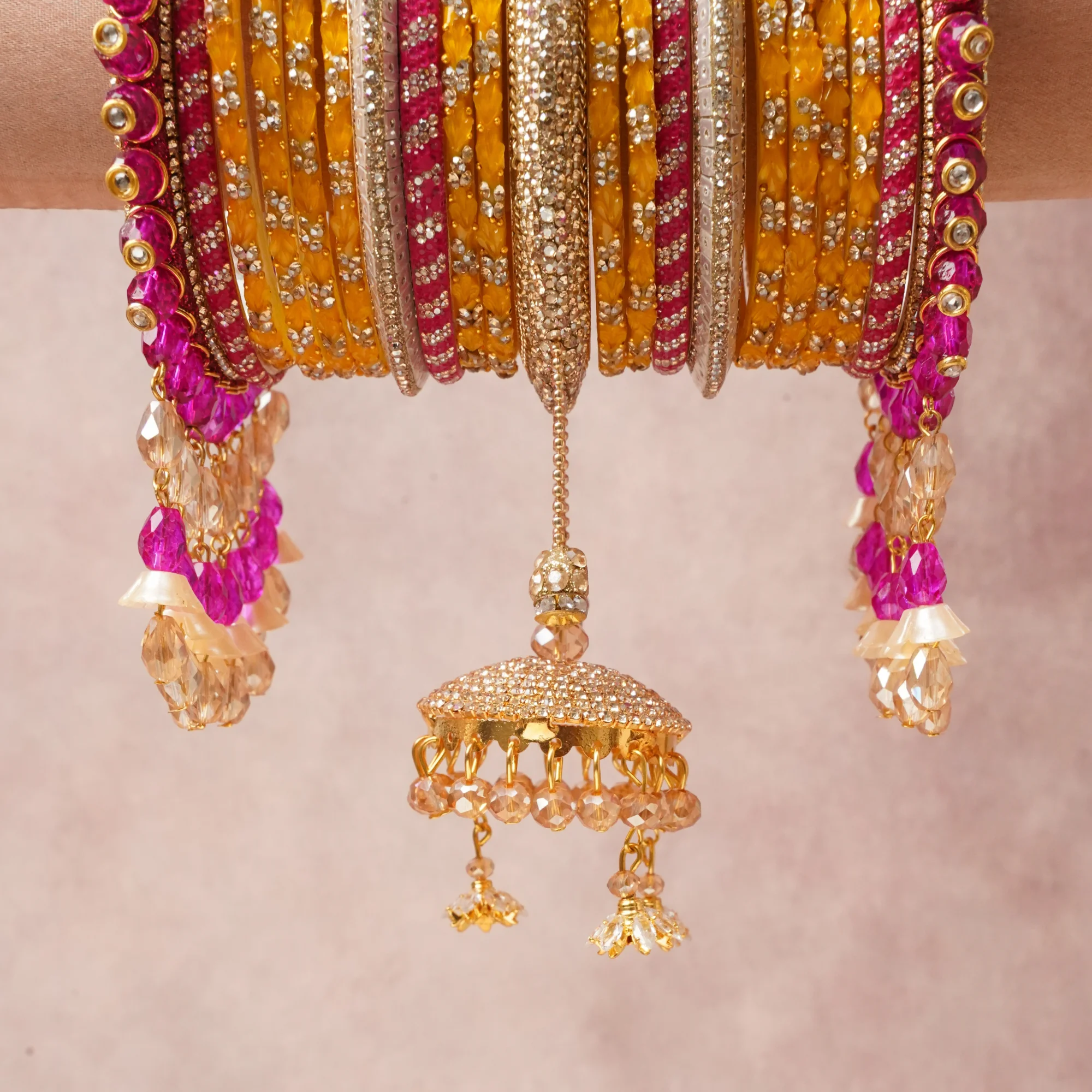 A commanding Golden Yellow anchors this beautiful set, enriched with accents of Pink that add depth and dimension. Featuring a striking composition of Lacquered Glass, Metal Alloy, Crystal, Faux Pearl, this set carries intricate craftsmanship and .strong presence. Grand in form, it is created for moments that deserve to be marked. Know More