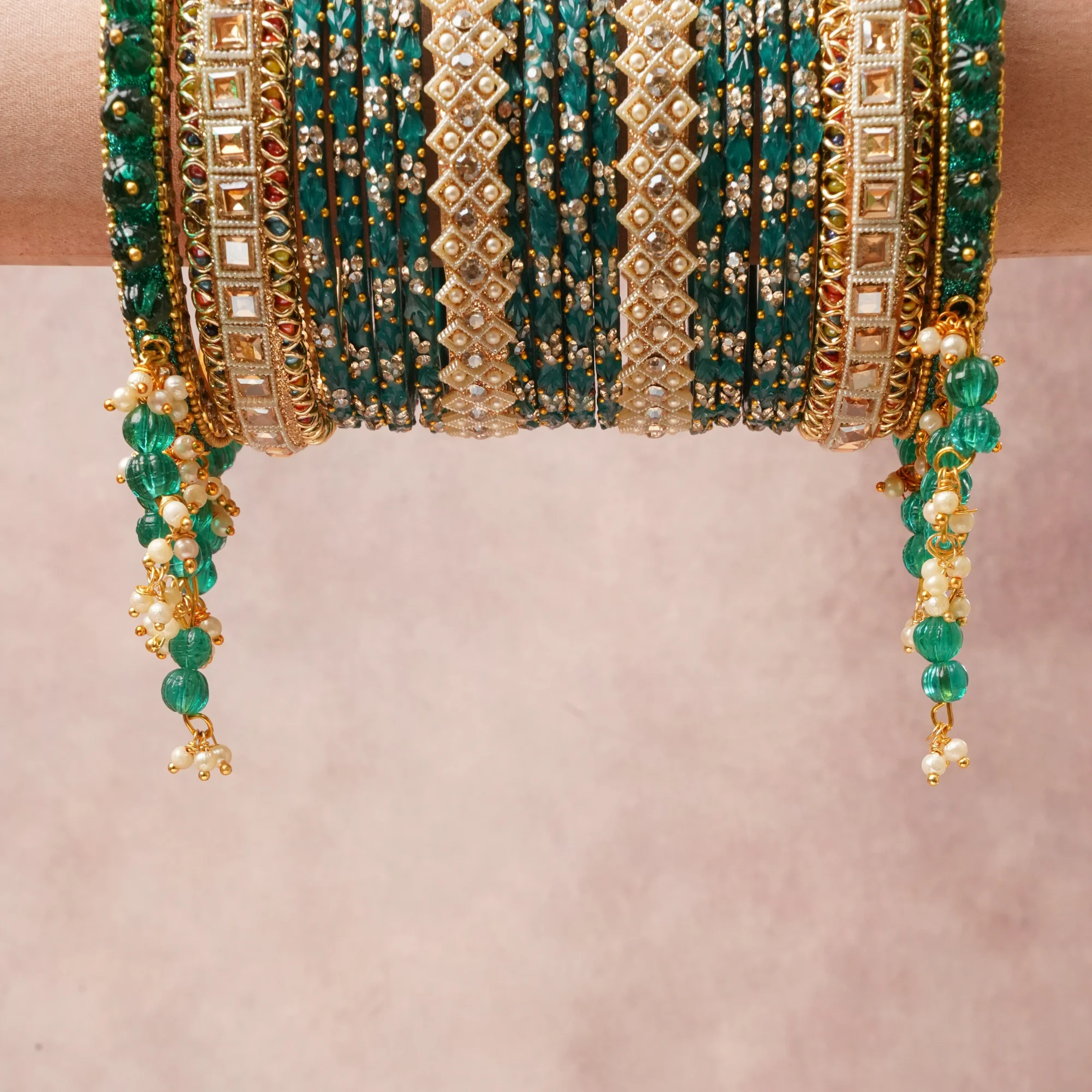 A commanding Emerald Green anchors this beautiful set, enriched with accents of Gold, Cream, Clear that add depth and dimension.