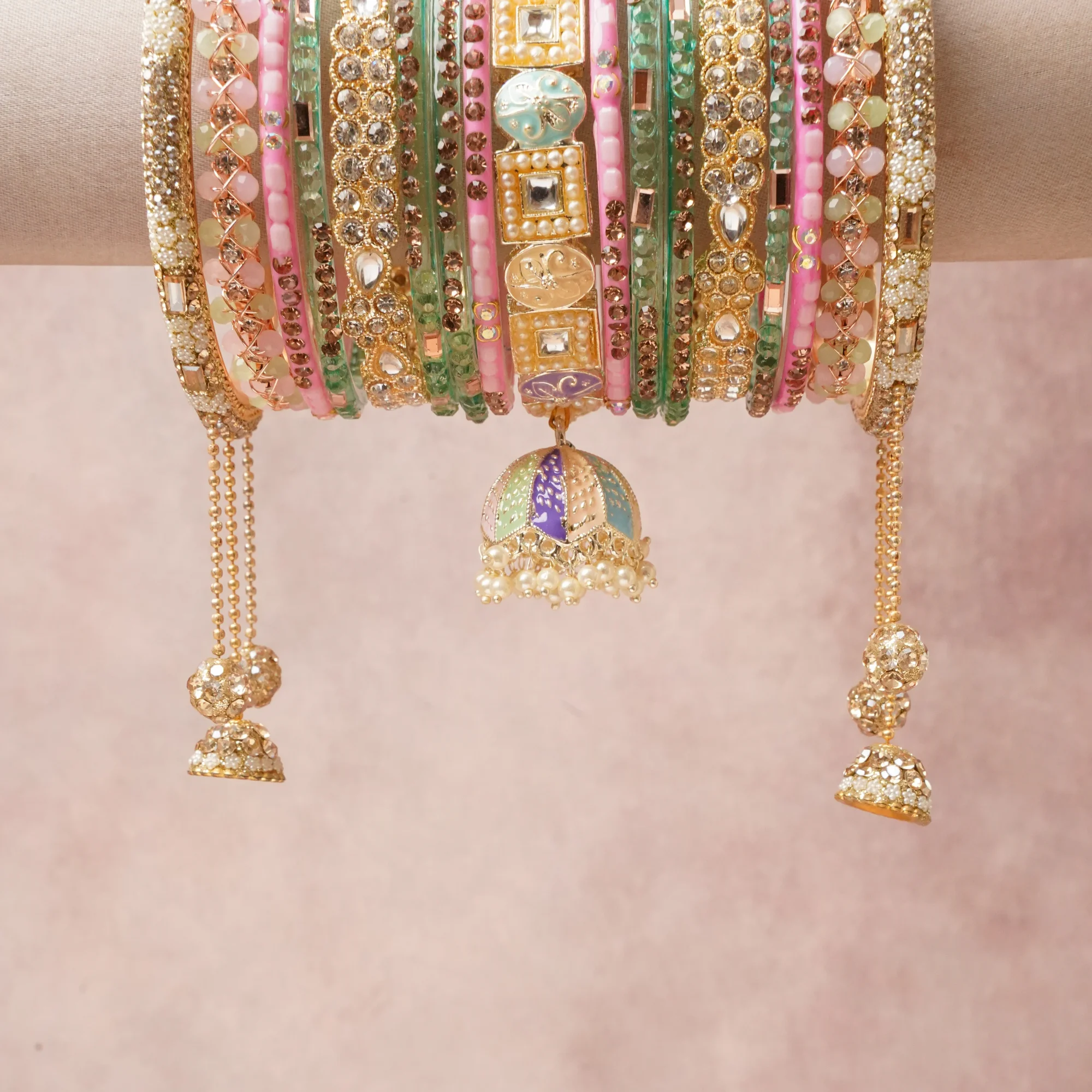 A commanding Gold anchors this beautiful set, enriched with accents of Cream, Teal, Mint Green, Clear, Lavender, Bronze, Blush Pink, Pastel Yellow that add depth and dimension.
