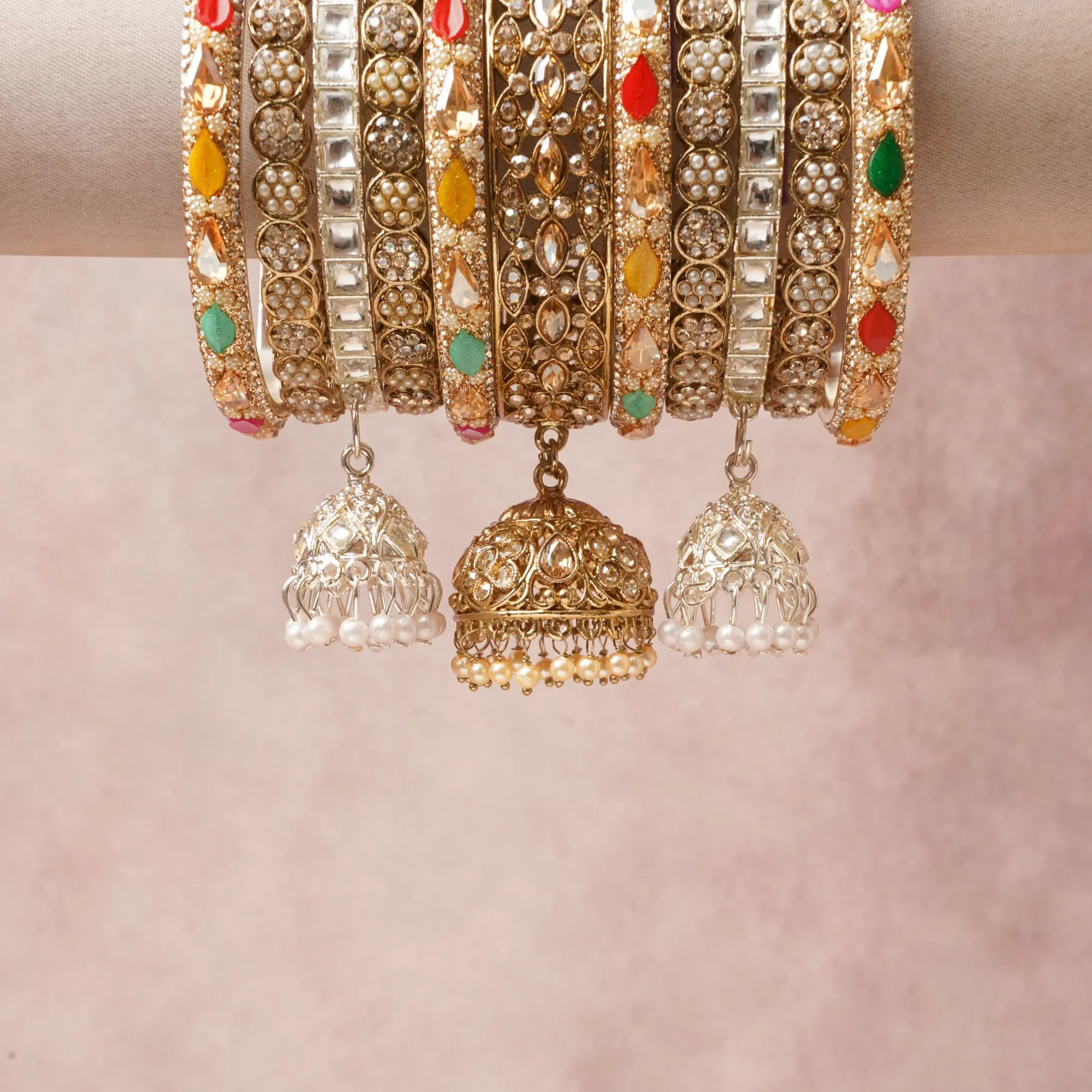 A commanding Antique Gold anchors this beautiful set, enriched with accents of Clear, Green, Red, Pink, Yellow, Orange that add depth and dimension.