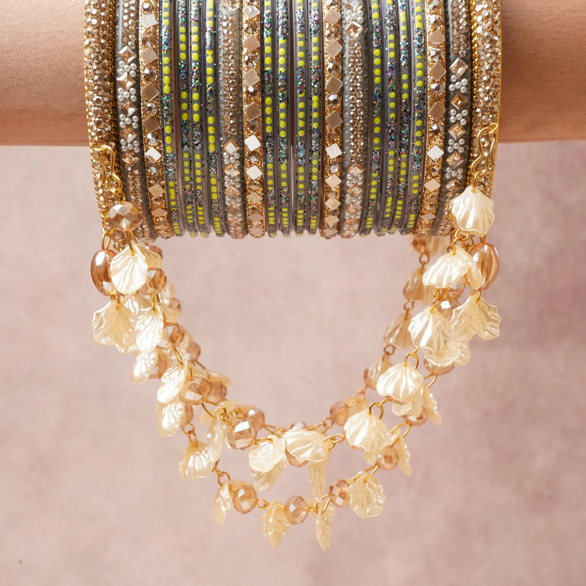 Featuring a striking composition of Metal Alloy, Rhinestones, Acrylic, Glass Beads, Glitte.r, Mother-of-Pearl, this set carries intricate craftsmanship and strong presence. Grand in form, it is created for moments that deserve to be marked.