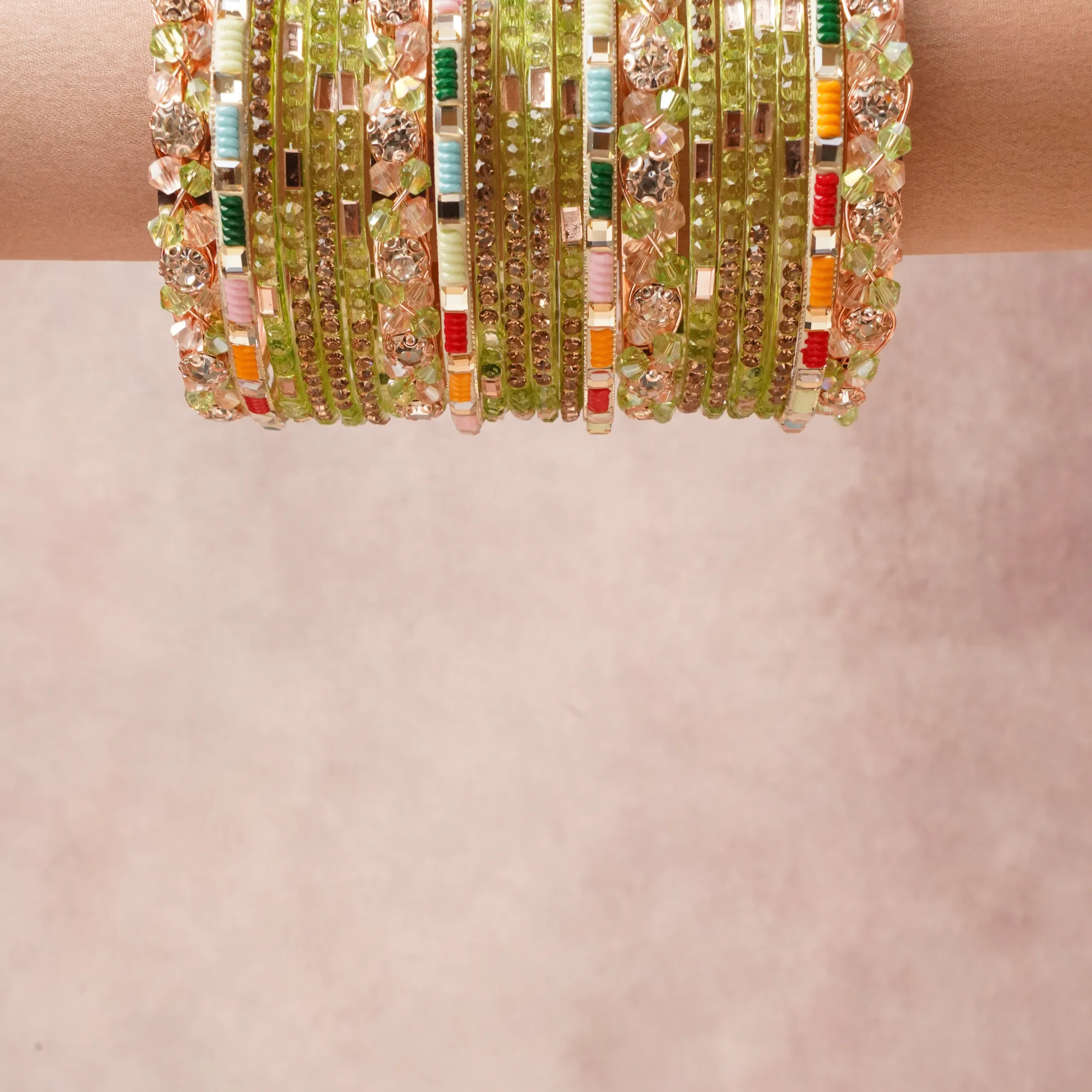 A commanding Lime Green anchors this beautiful set, enriched with accents of Clear/Transparent, Gold, Coral Red, Marigold Orange, Sky Blue, Rose Pink, Emerald Green that add depth and dimension.