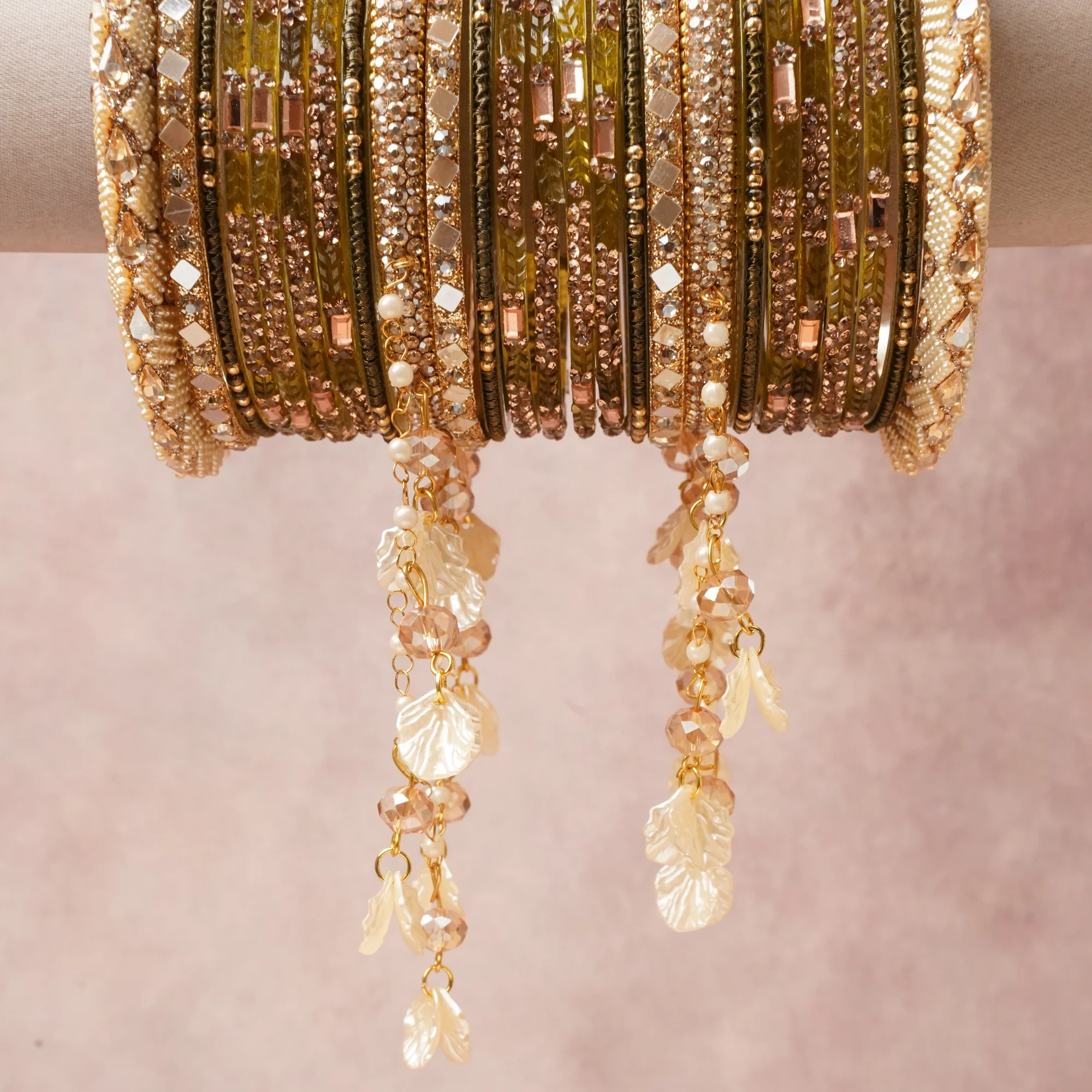 A commanding Olive Green anchors this beautiful set, enriched with accents of Clear Crystal, Rose Pink, Cream, Champagne that add depth and dimension.