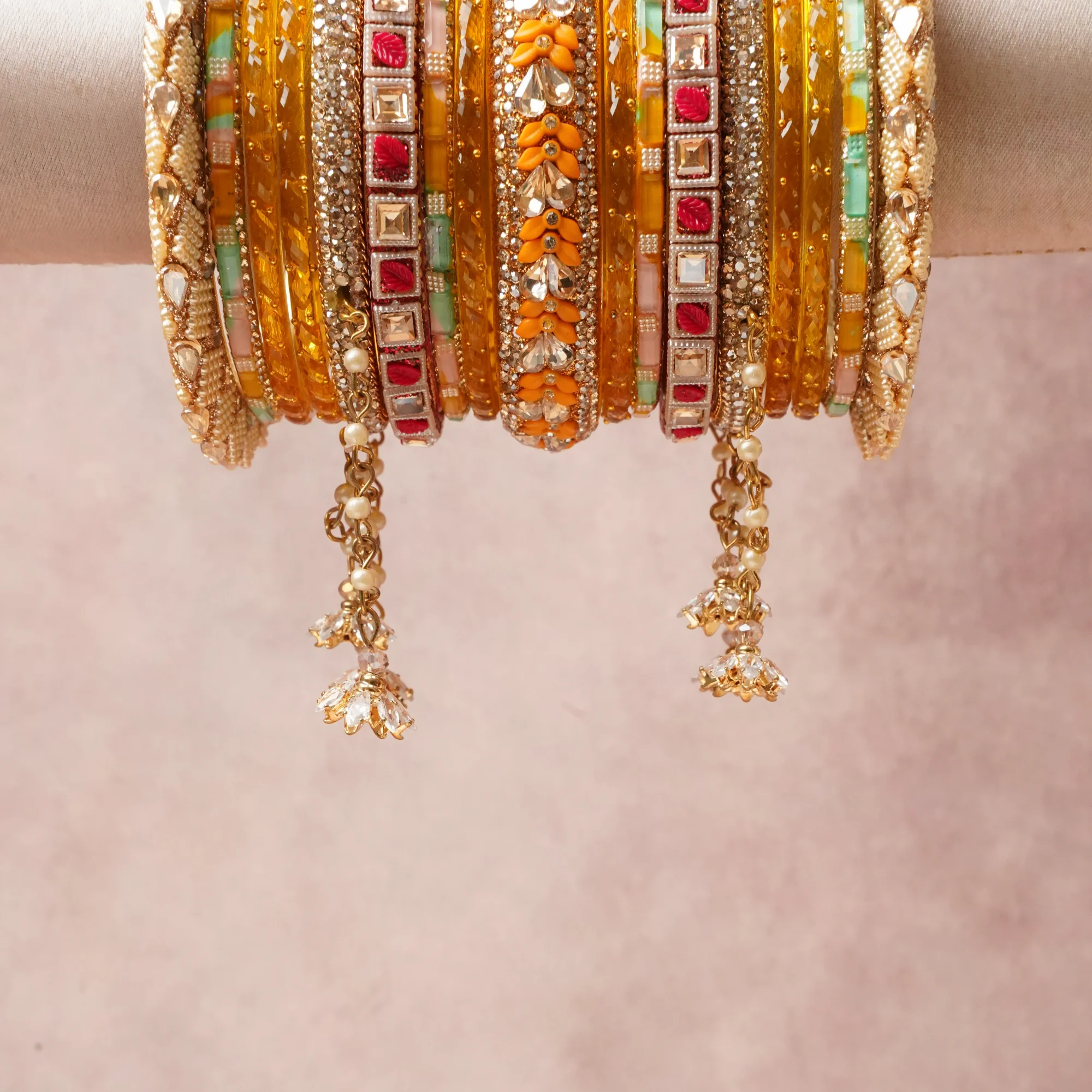 A commanding Golden Yellow anchors this beautiful set, enriched with accents of Deep Red, Coral Orange, Mint Green, Clear Crystal, Pearl White that add depth and dimension.