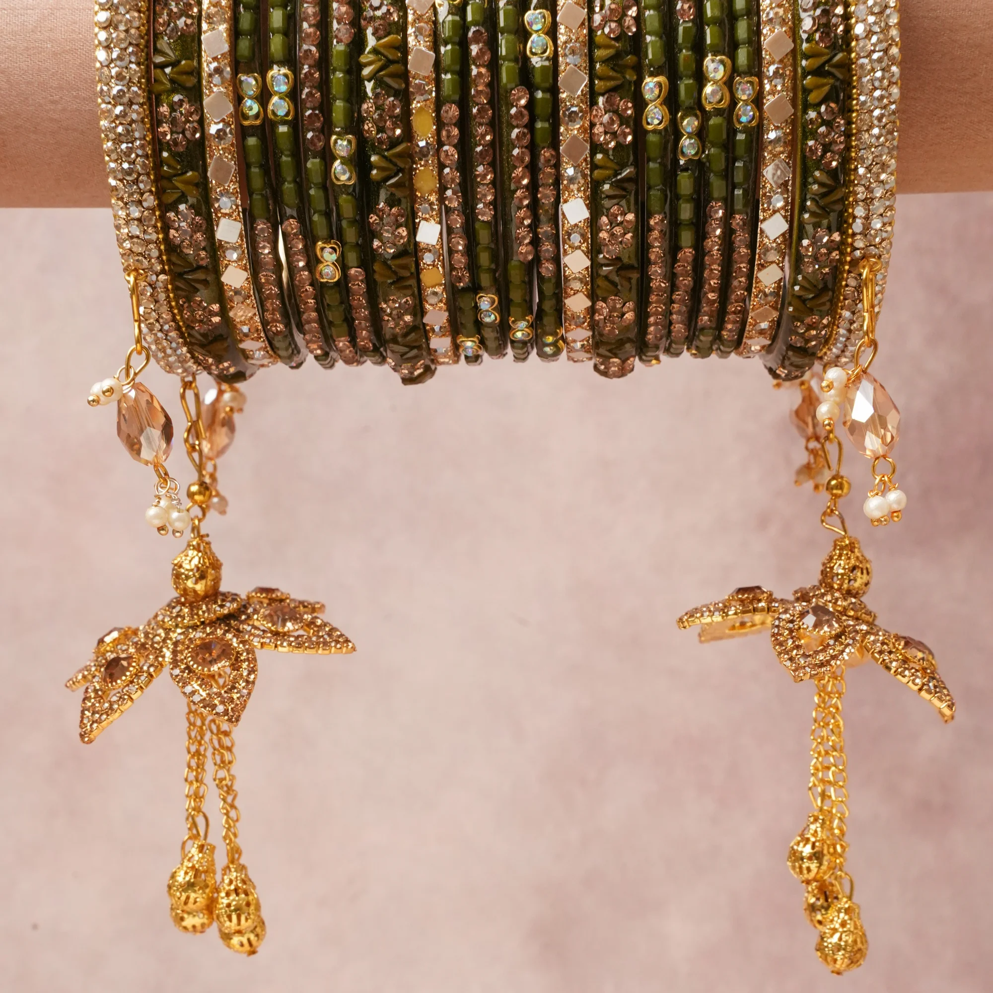 A commanding Deep Olive Green anchors this beautiful set, enriched with accents of Clear Crystal, Champagne Crystal, White Pearl that add depth and dimension.