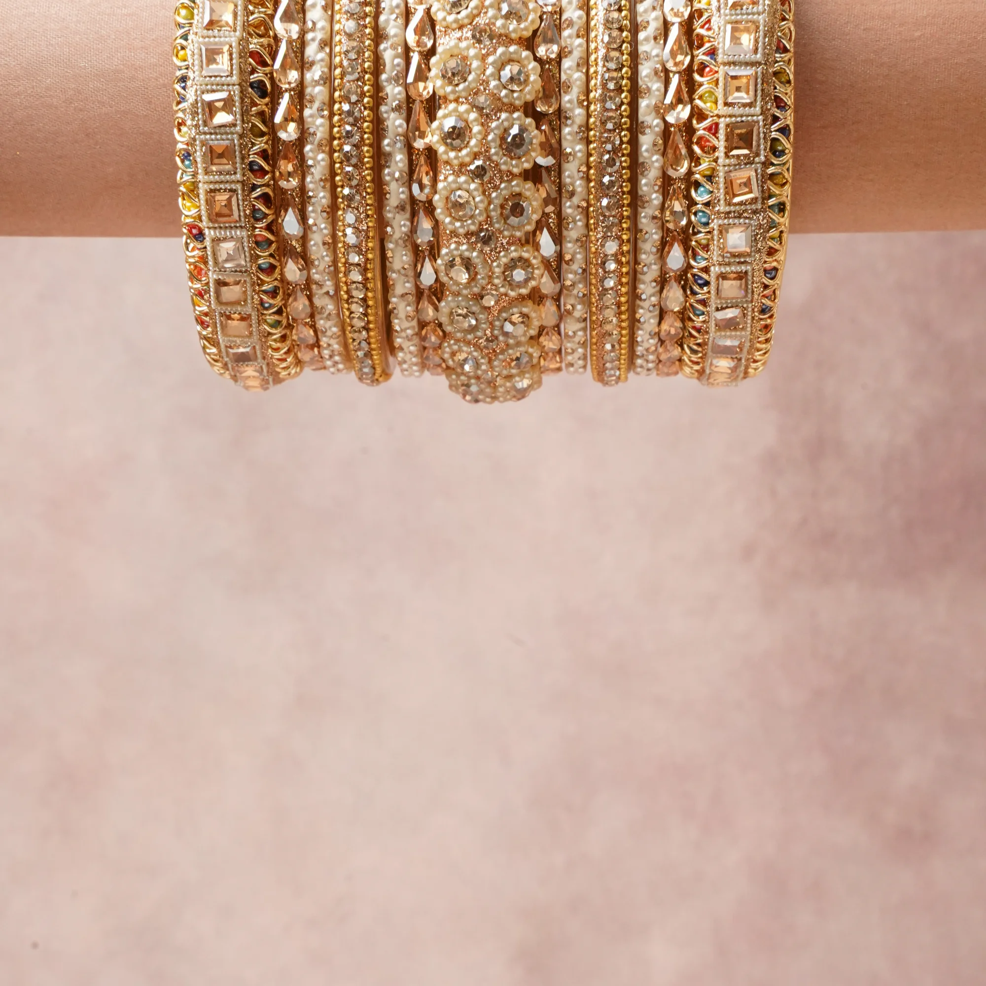 A commanding Gold anchors this beautiful set, enriched with accents of Clear, Cream, Champagne, Multicolor Pastels that add depth and dimension.